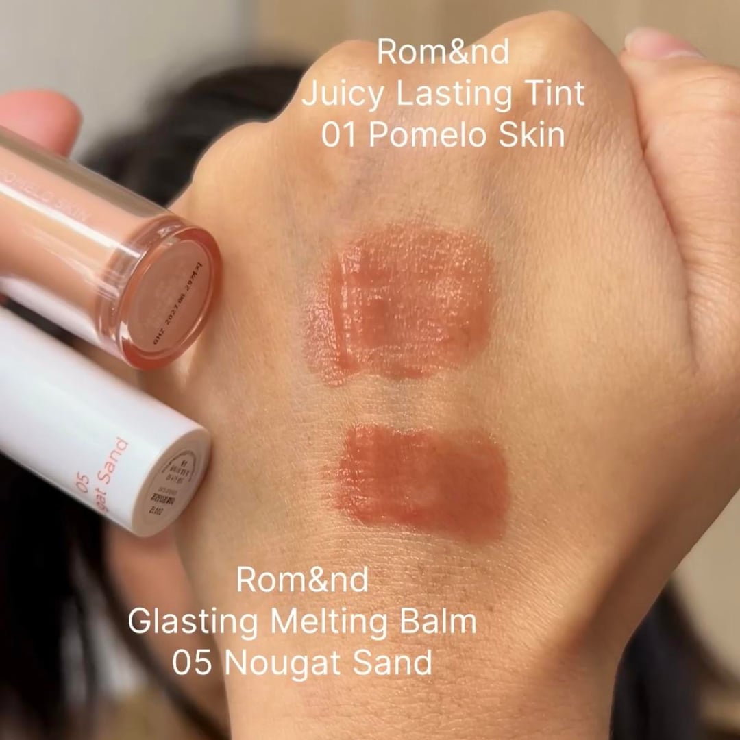 Hey y’all, today I compared Rom&nd Juicy Lasting Tint 01 Pomelo Skin and Glasting Melting Balm 05 Nougat Sand.