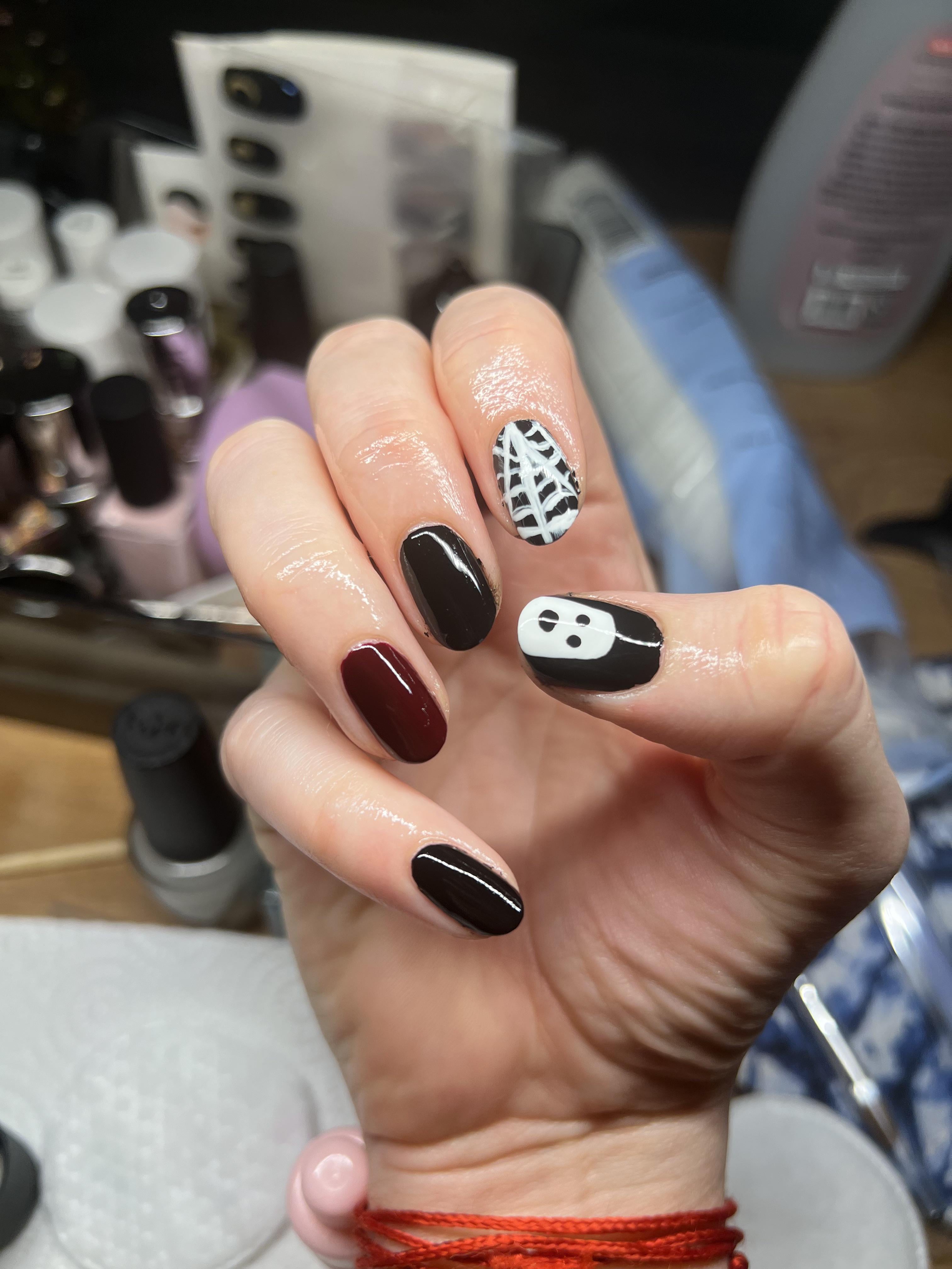 i saw someone post their little nail ghosty earlier and wanted to try it! if you think the spiderweb is janky, you should see poor mr spider on my other hand.