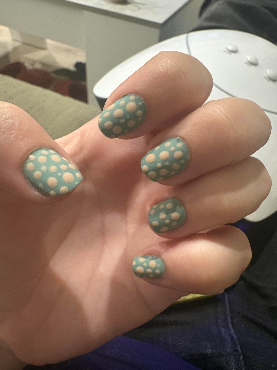 I try to have fun / cute nails since I work in a school. I used to get them professionally done, but since it is quite expensive I’ve decided to do it myself, stick to simple cute colour combinations, so I can chance them every couple weeks, keep them clean (working with children that is a priority for me, can’t wear them super long and the shape needs to be simple to maintain) and express my personality through them.