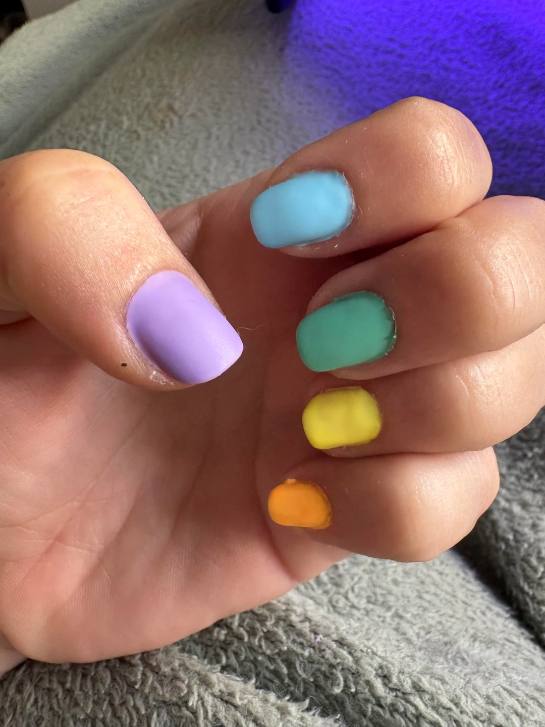 I use phoenixy nail lacquer, colours V190 (purple) V188 (blue) V143 (green) V210 (yellow) and V209 (orange), with a matte top coat of the same brand.