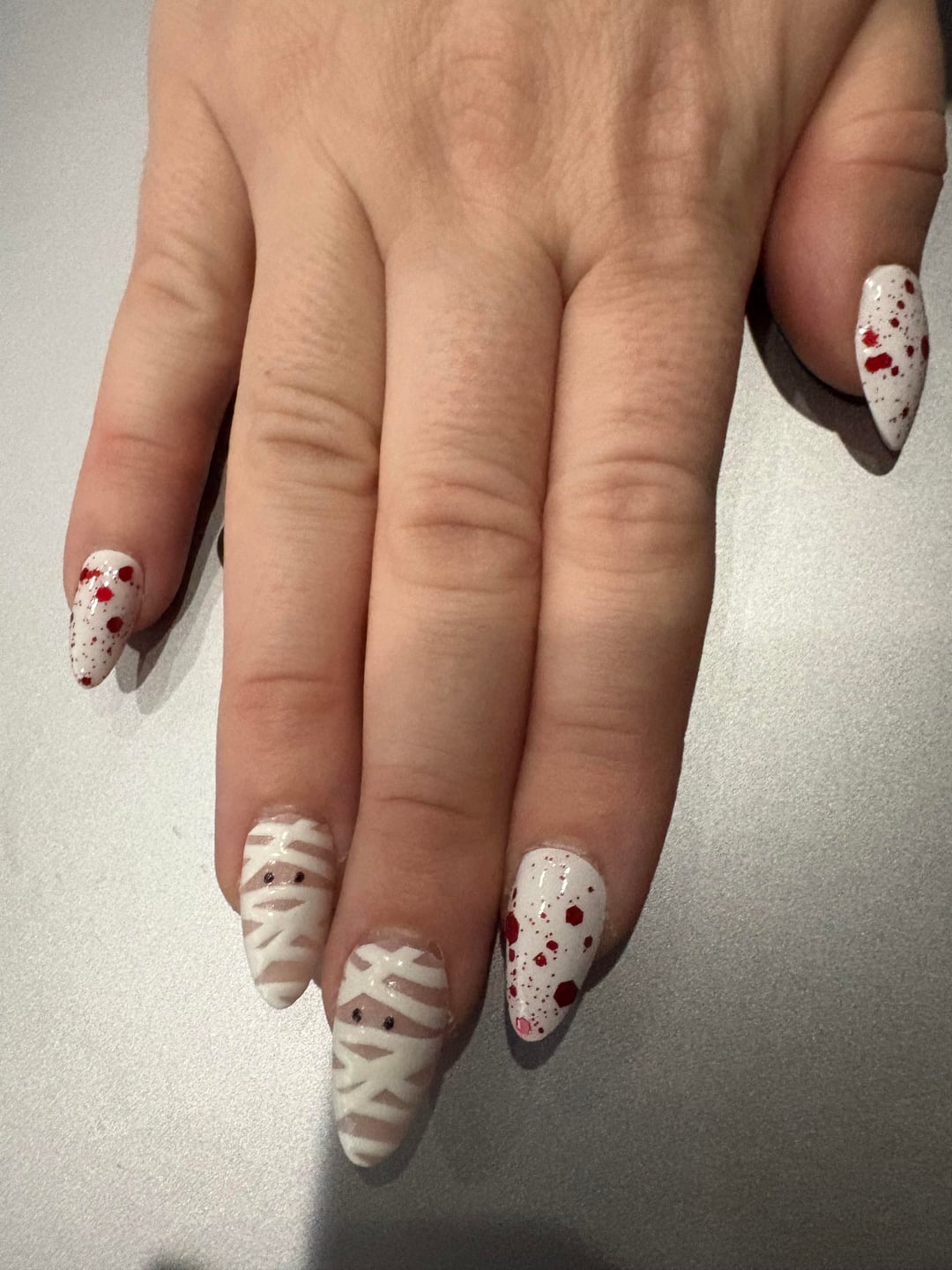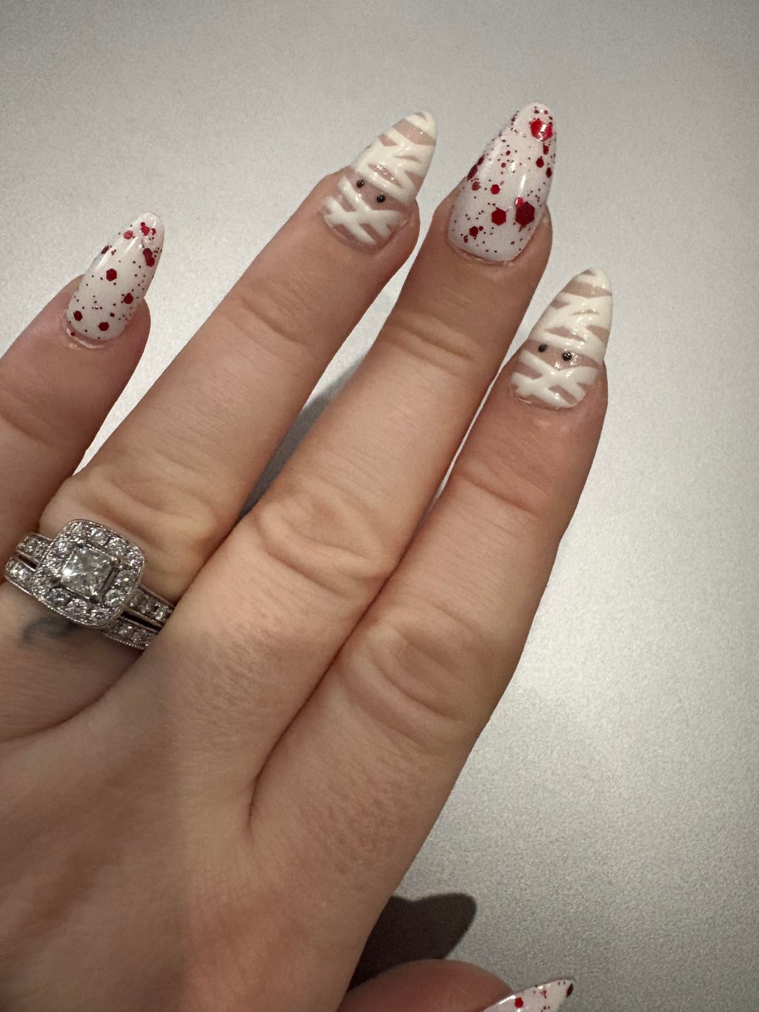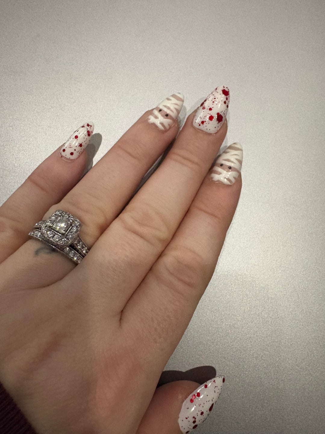 Lacquer 22 Guts (red splatters) over Glamnetic Wrapped Up Press ons on the white nails. I also put an LA Girl glow in the dark top coat over the mummies but that’s not really visible during the day.