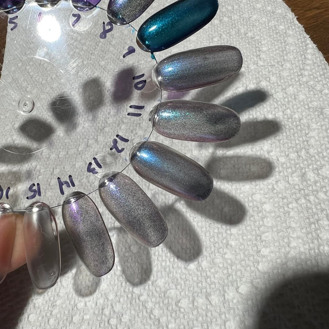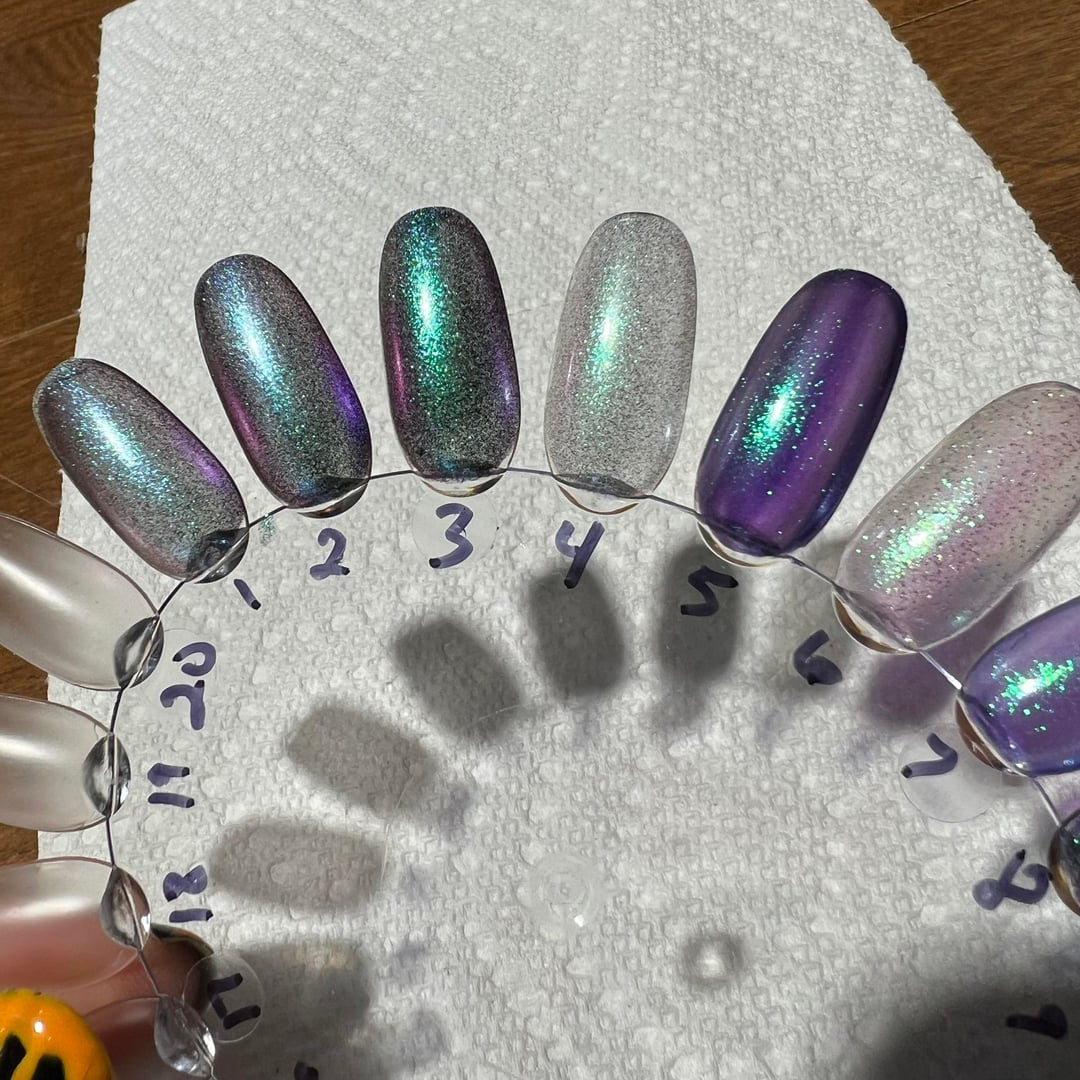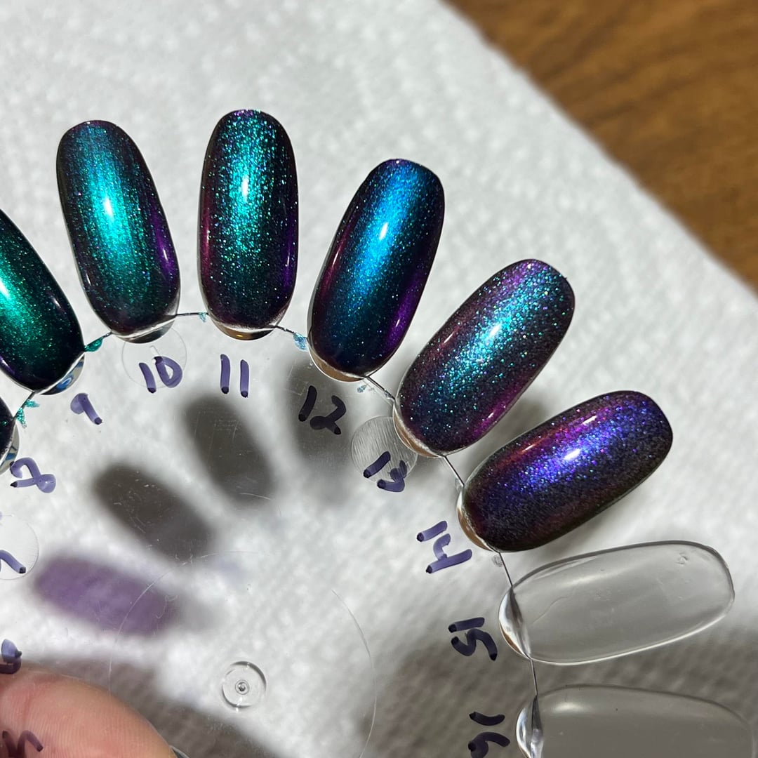 Pic 17 and 18 is the swatch wheel in indoor lighting capturing the purple shifts best.