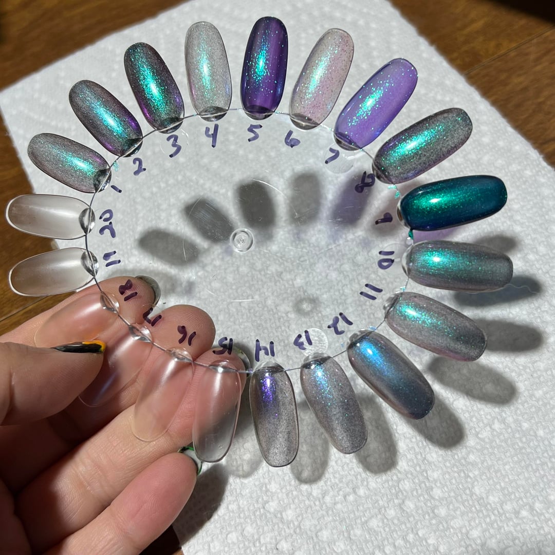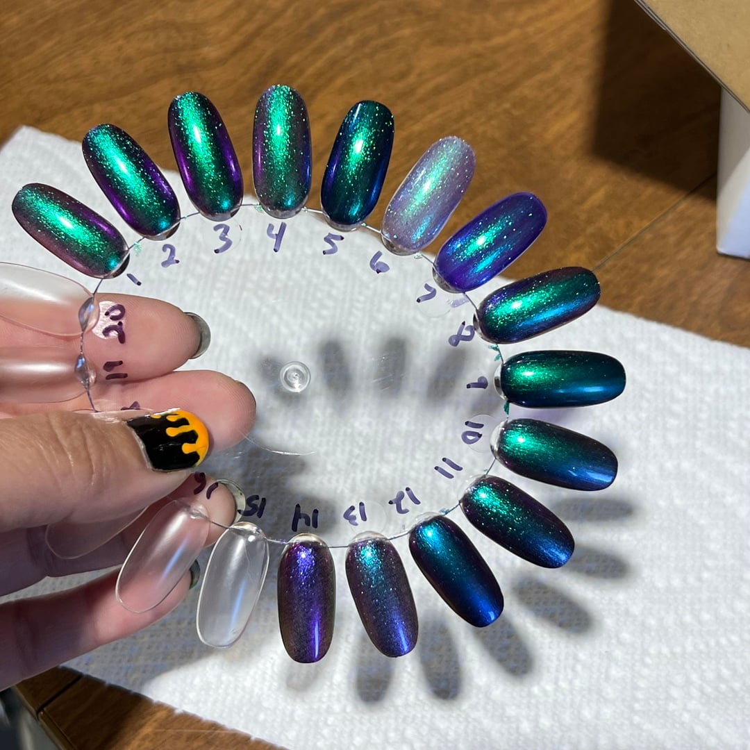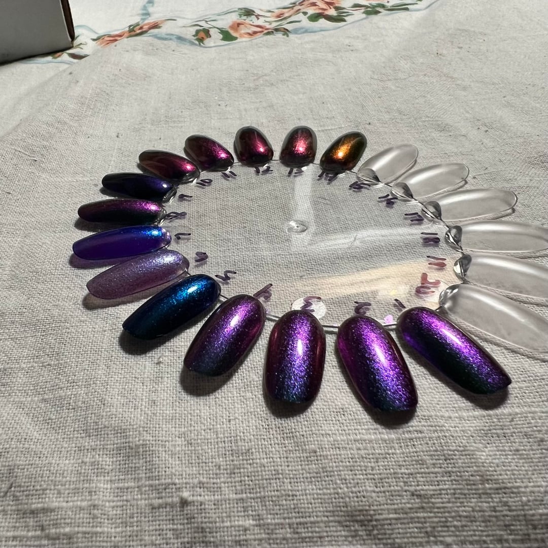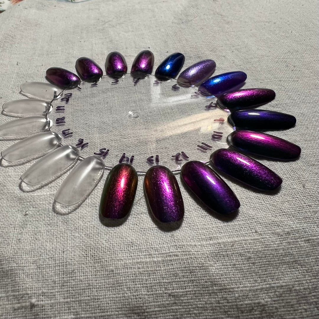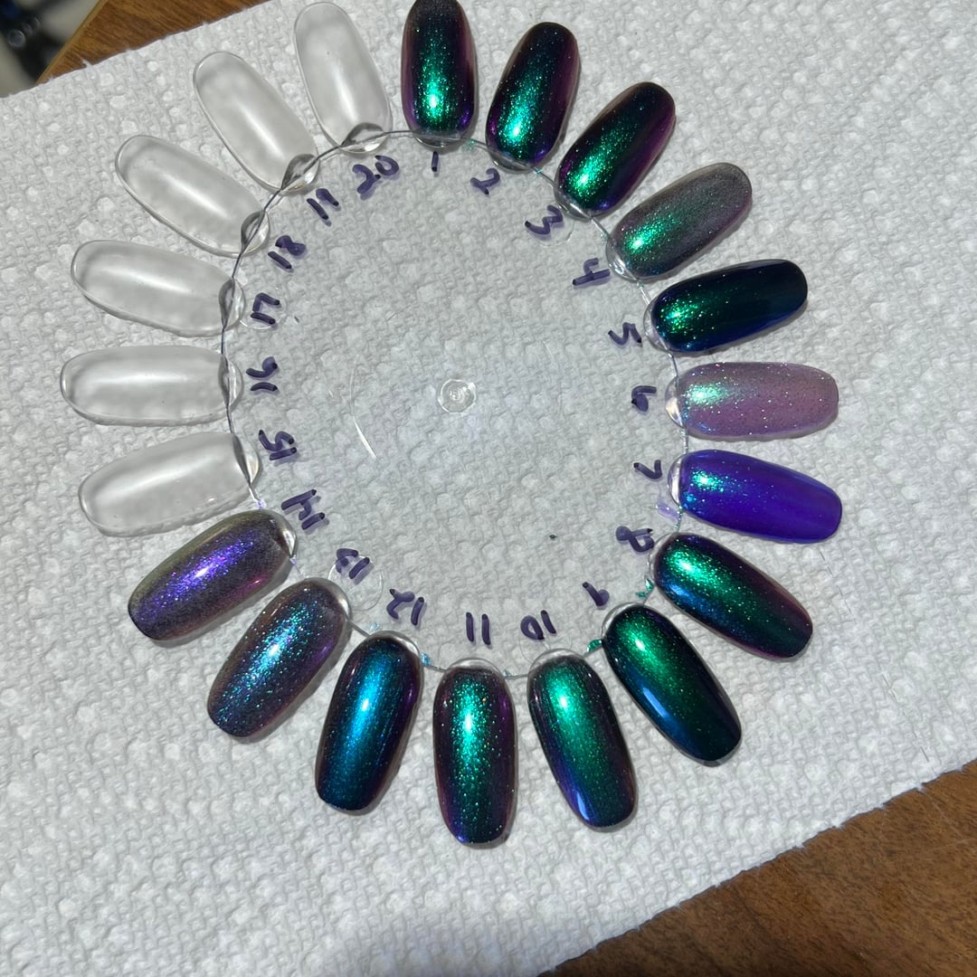 Multichrome madness!!! I have definitely been duped and i aint even mad about it🤣. This swatch wheel is made of clear plastic. The descriptions show how many coats to opacity as some are more sheer than others.