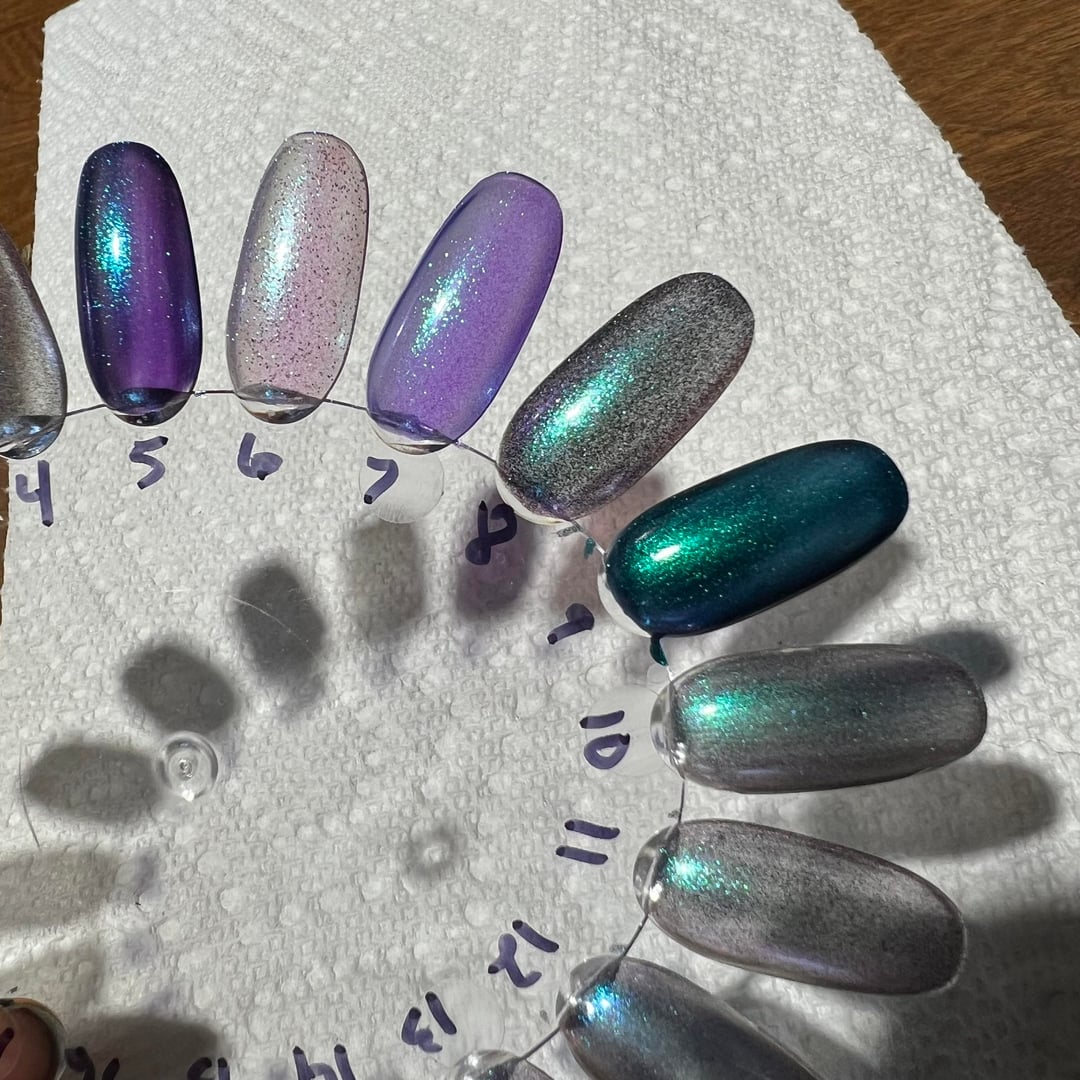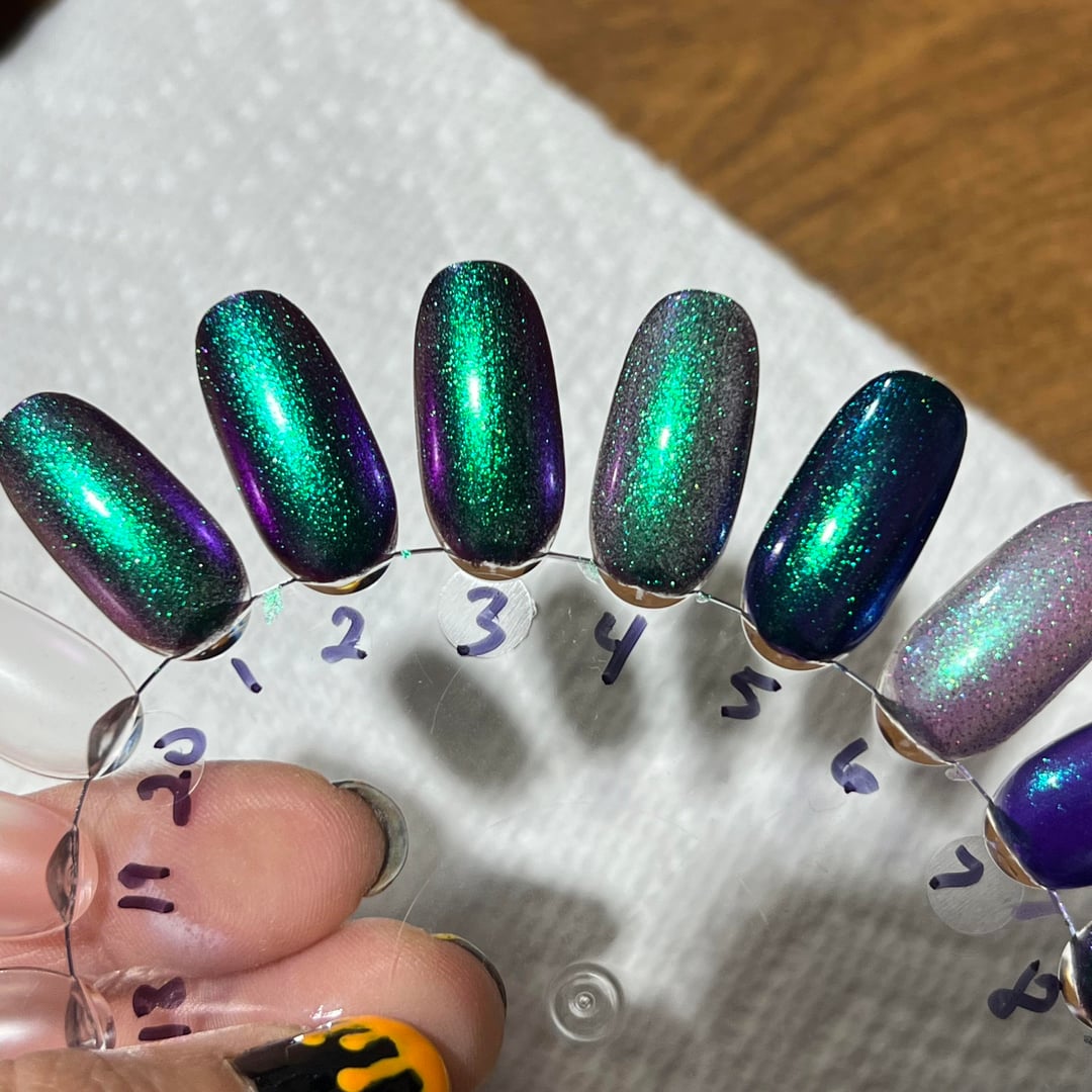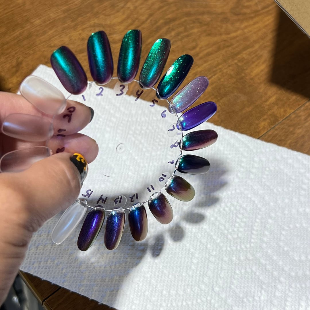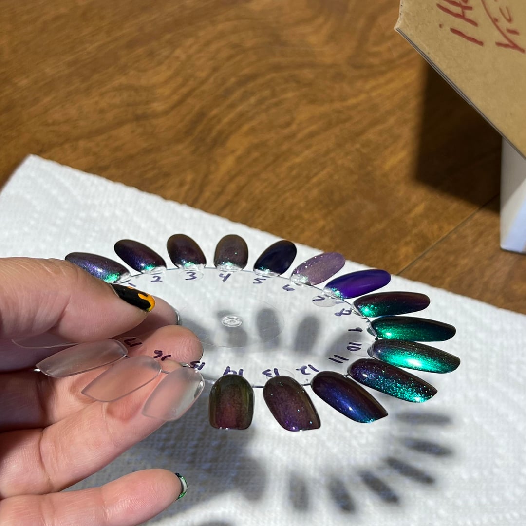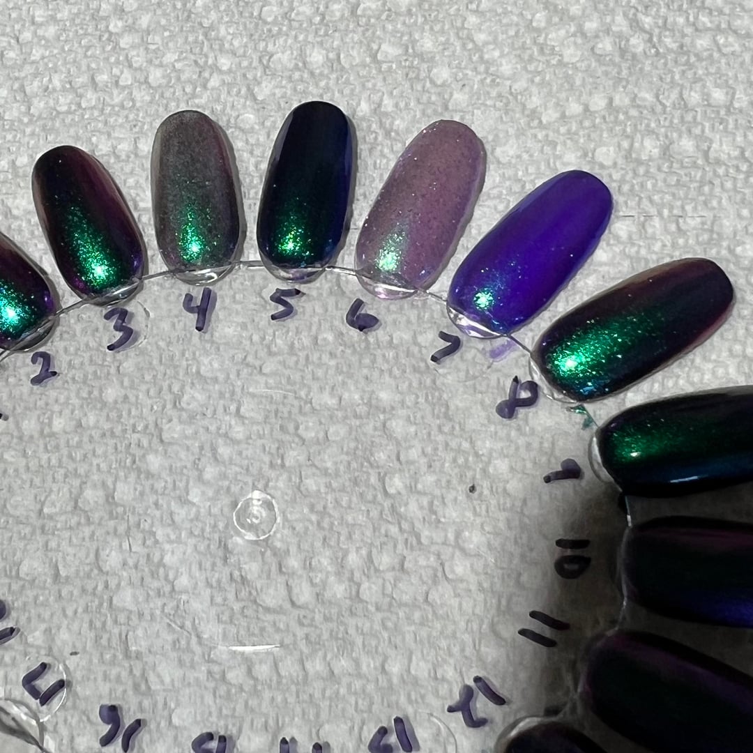 Multichrome madness!!! I have definitely been duped and i aint even mad about it🤣. This swatch wheel is made of clear plastic. The descriptions show how many coats to opacity as some are more sheer than others.