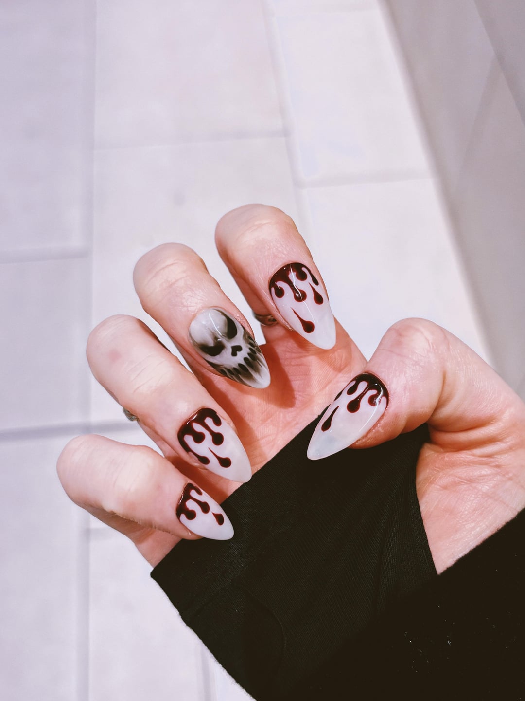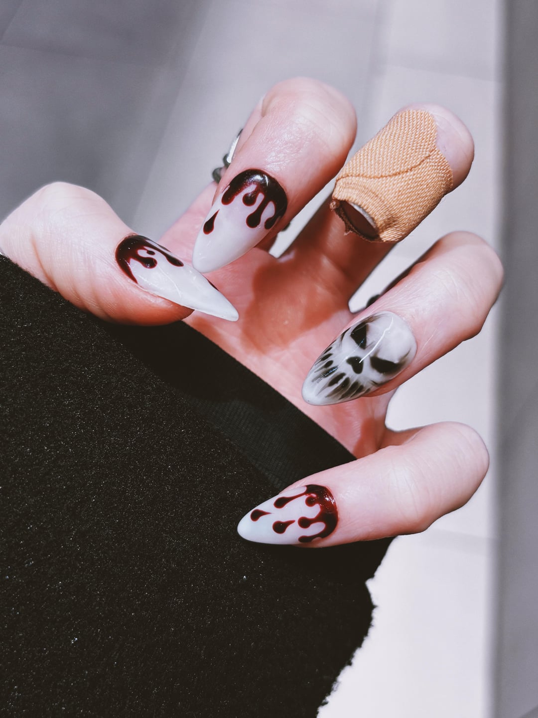 Didn’t have much time to make these so I went simple but still happy with them. Ignore the middle finger in my left hand. Hit my finger hard with my previous set and my natural nail broke edge to edge midway the nail bed. Hurt like a mf 💀.
