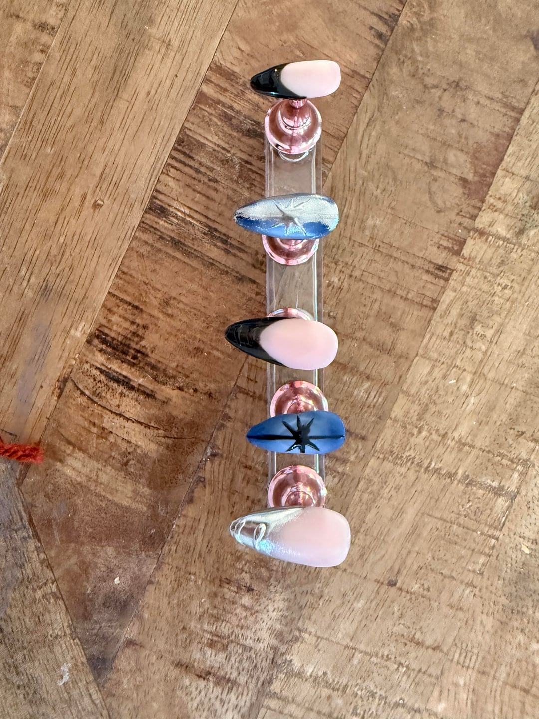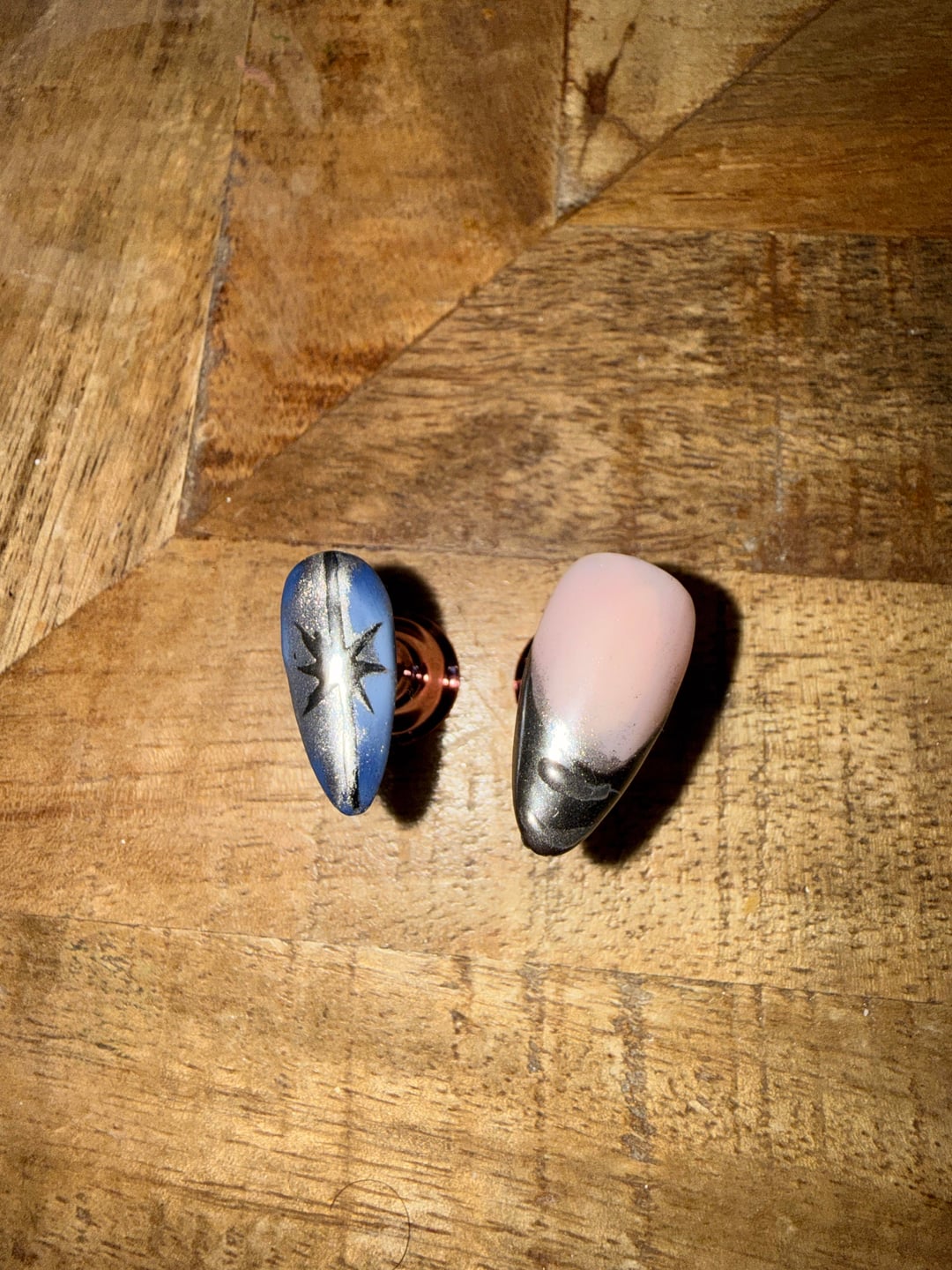 I started doing my own nails as press-ons a few months ago and I just started isolated chrome. For some reason the chrome powder is sticking to the matte base coat that I put down before? I really need some advice because I really don’t want to have to throw these away and start again. I’ve only done 2 so far so any advice is appreciated to fix these ones and do the next ones right! Thanks in advance 💗 (Also again I’m only a beginner so I’m aware my designs are a bit shaky but I’m practicing)