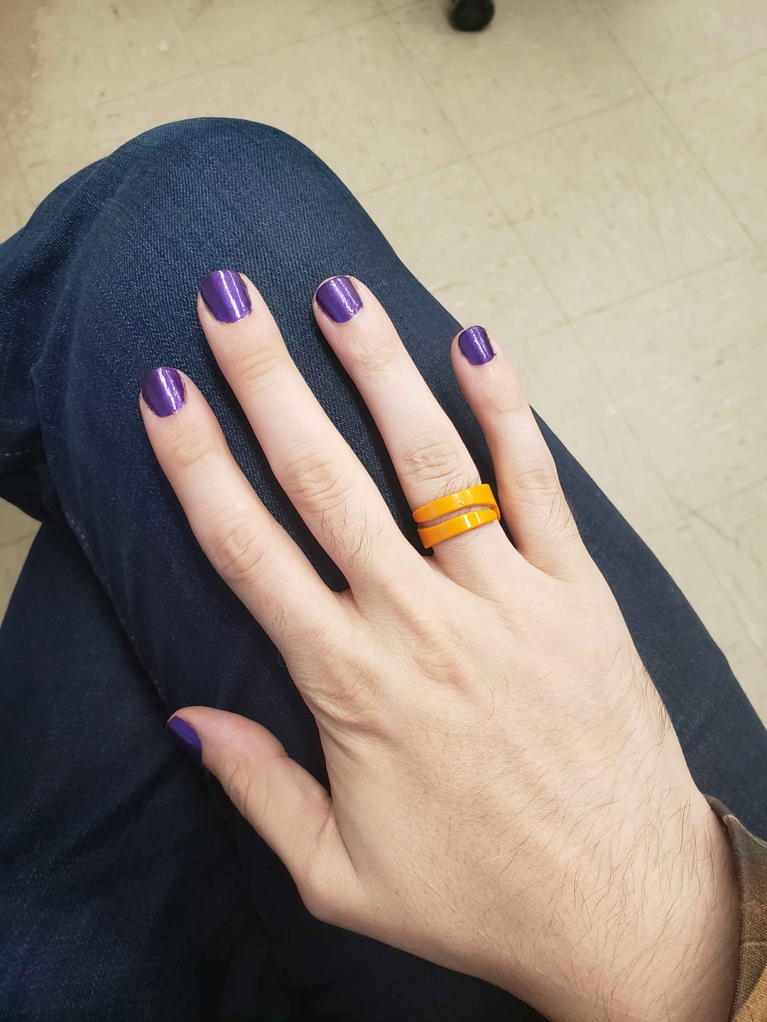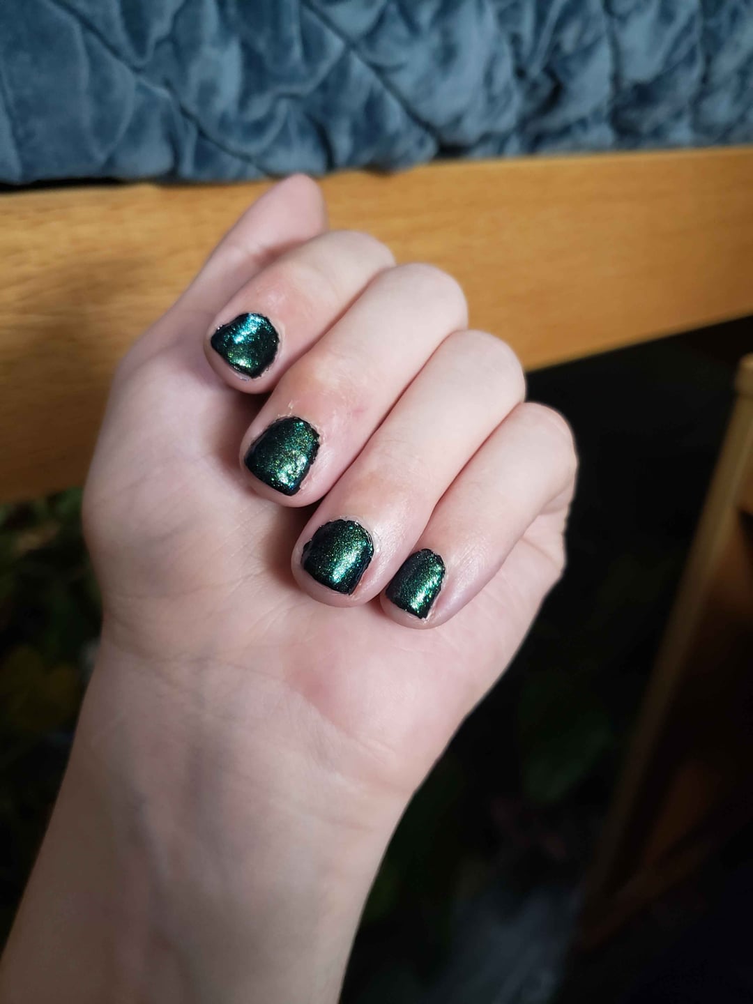 Hi! I just wanted to share my first experiences painting my nails. I'm a guy so I was very nervous and self conscious, but I've gotten nothing but compliments about it 🙂 The first is LA Colors 'Mermaid Magic' in teal layered over LA Colors black. It was really surprising because it's bright blue on its own, but on black it turns a two tone dark blue or dark metallic green depending on the viewing angle.