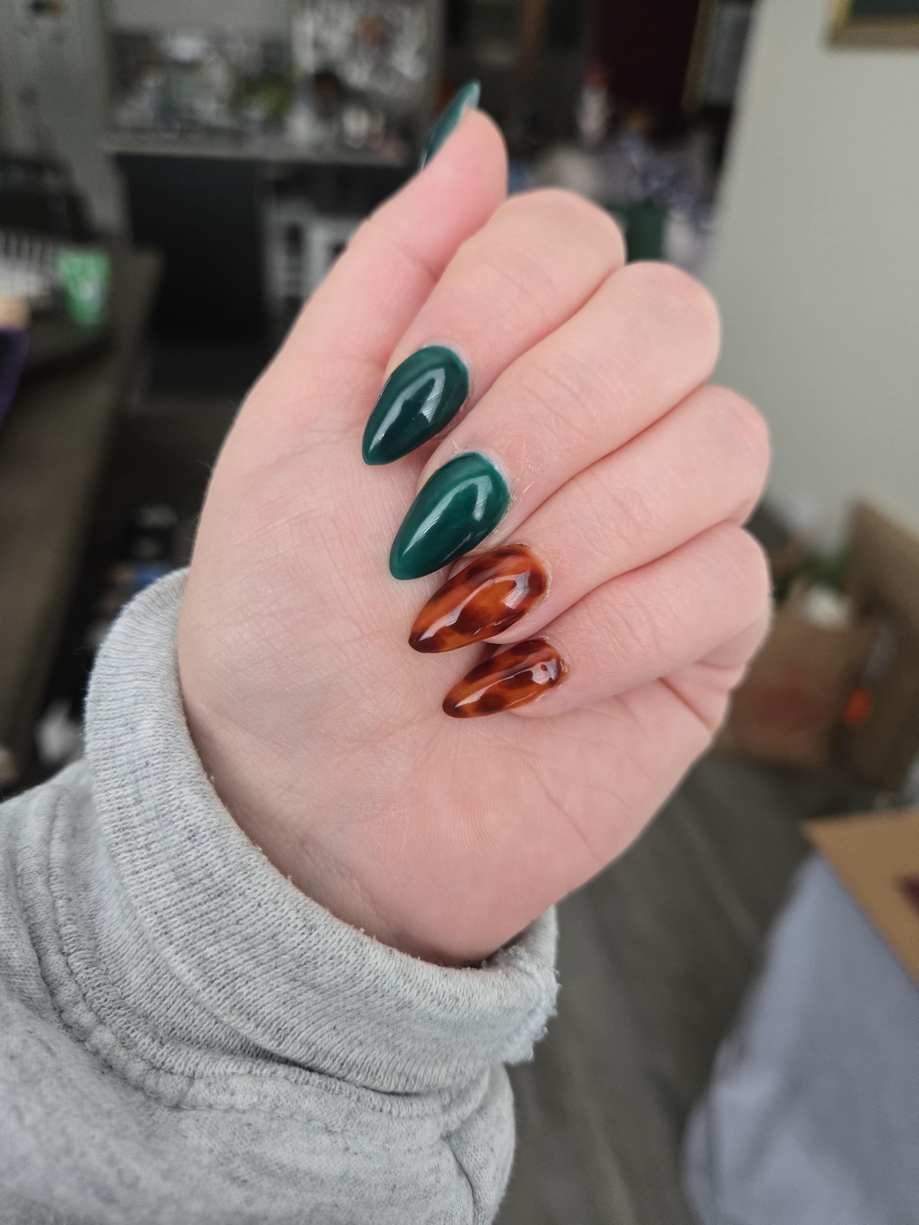 But nope. It was a 55 dollar fill (makes sense) but a 5 dollar fee for a cut down and reshape (okay fine for the reshape) but then an extra 5 for medium length (this doesn't seem medium to me?) And 25 for the design (2 "tortoise" nails per hand and the more I look at it; the more im like unhappy with the "tortoise")