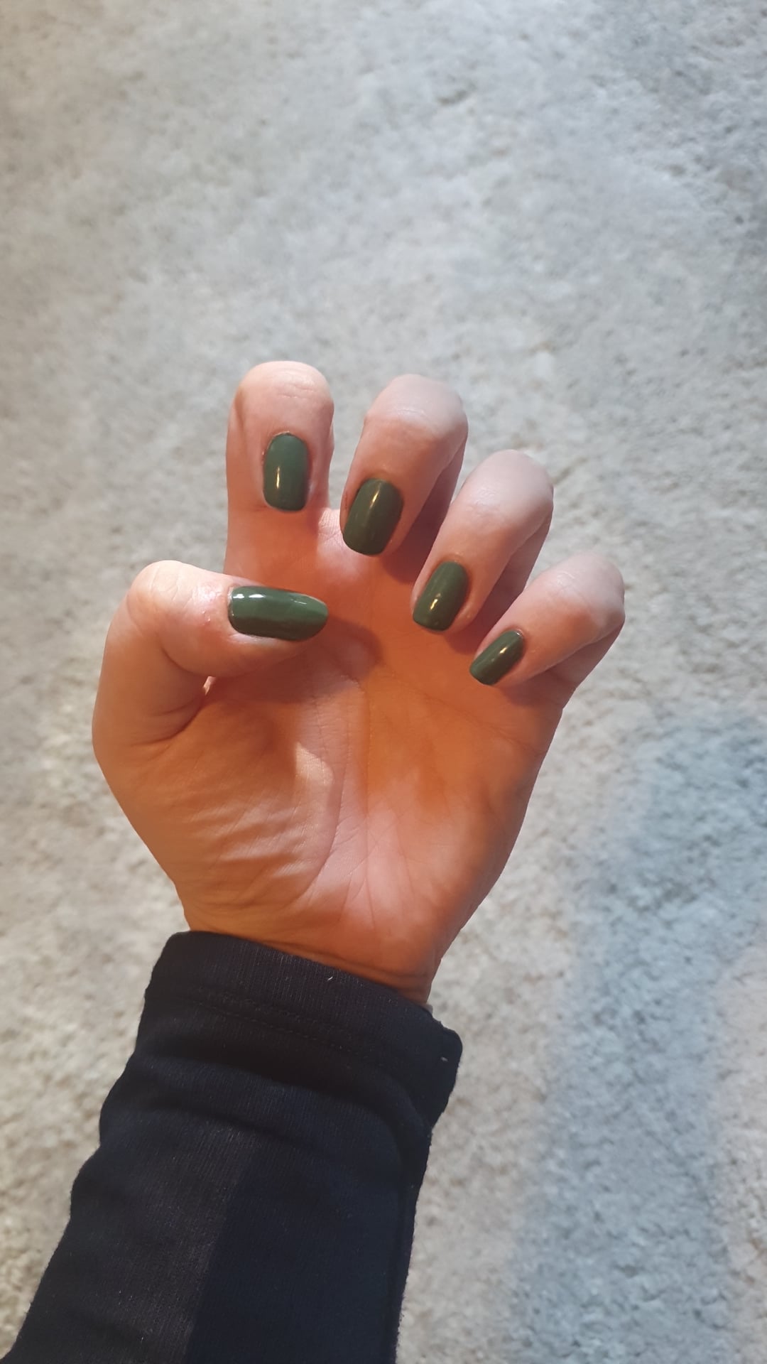 Products are Sally Hansen maximum growth base, holo taco modest moss (2 coats), and essie gel couture top coat. Also lots of jojoba oil on the cuticles!