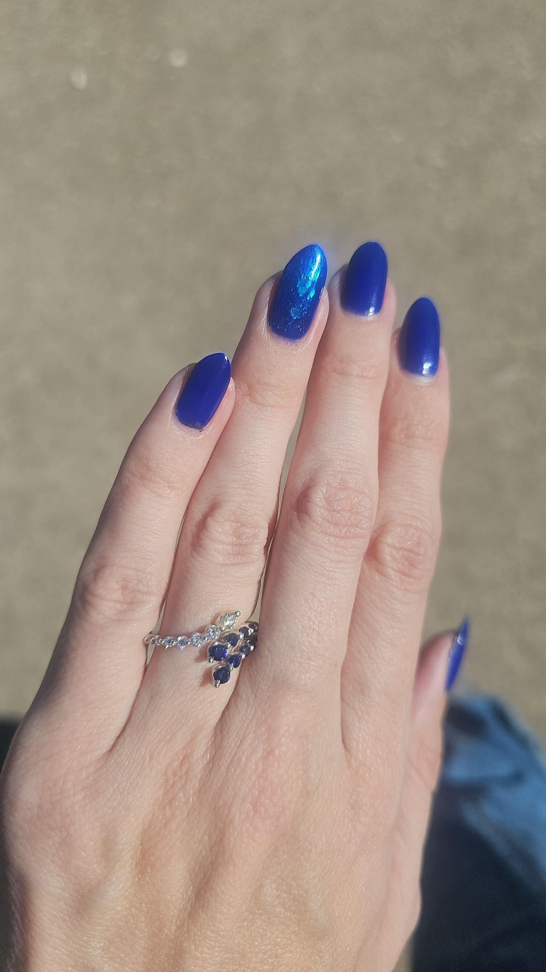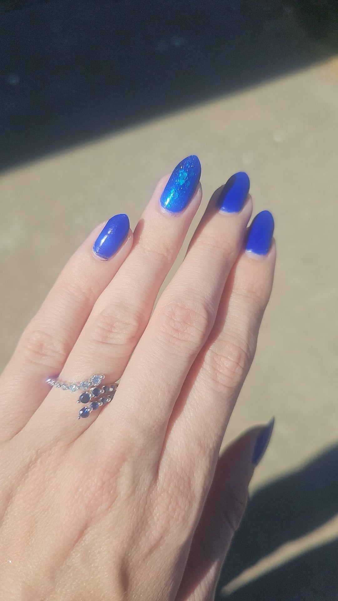 Base coat: nailtek hydrate 2x coats holo taco royal-tea blue on all fingers 1x coat dany vianna rainbow fluoride v.2 on ring finger Top coat vibrant scents fast and hard by Vault_Gal_1217
