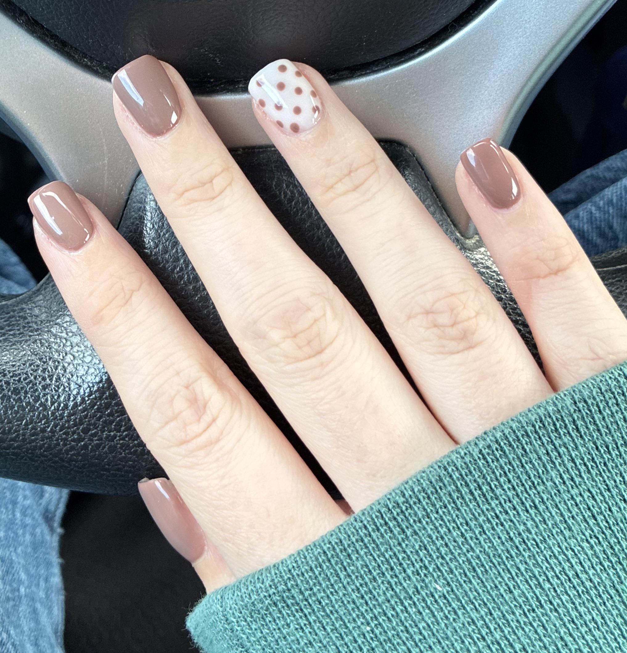 Had to shorter nails to be able to play my instrument. Feels so strange but I think they turned out so cute 🥹 Wanted to hop on the polka dots trend 🤎🤍 by NuageN0ir