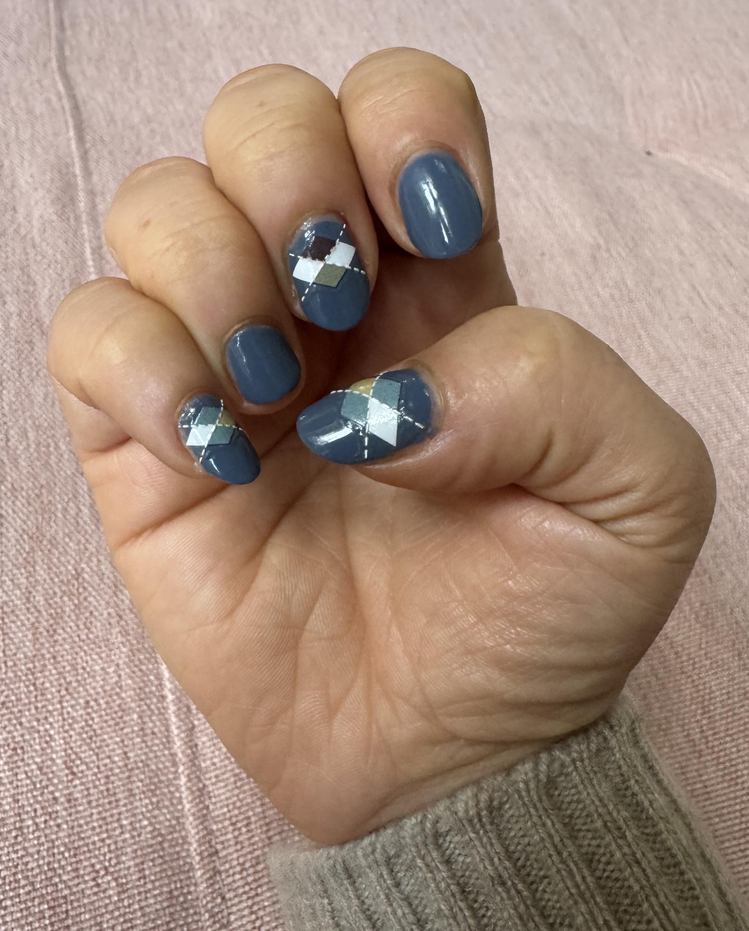 Orly bonder, CND vinylux Denim (3 coats), some random stickers I honestly can’t tell you the name of, and cnd vinylux topcoat (2 coats). Should I do a matte coat overtop?!