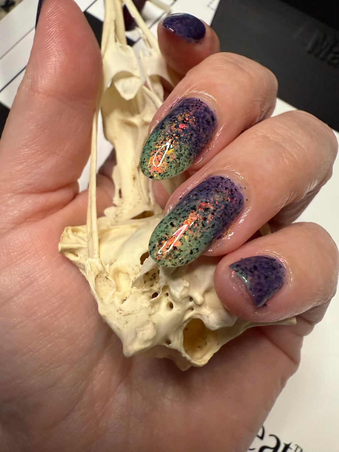 Guest appearances from a corvid skull, a cast of a human a rib with a bullet it healed around, and my recently broken pinky nail I was just growing past the hypochynium before removal.