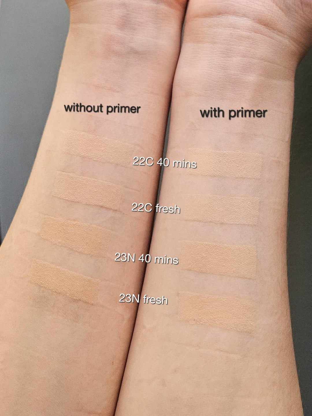 However, despite that, it actually barely oxidized on my skin, with or without primer. Though after 40 mins 23N looks a little bit warmer in person than my camera could capture, it really wasn't by a lot like I've seen in other way older photos.