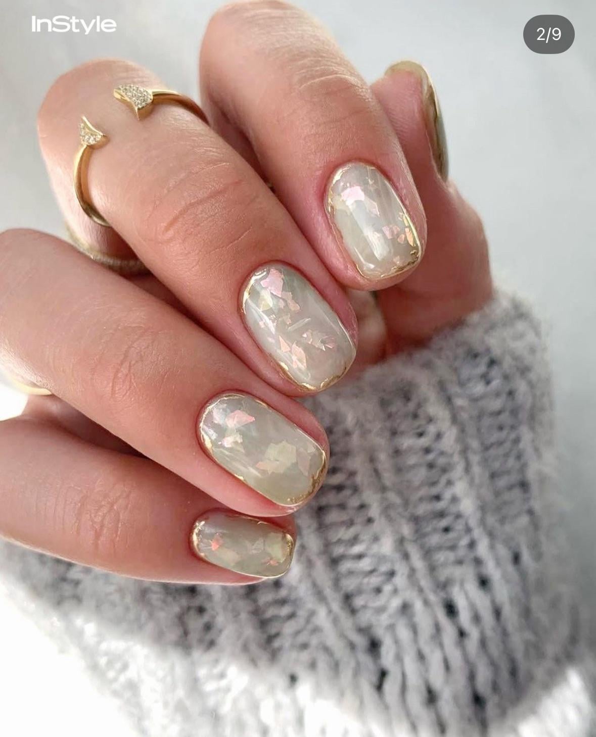 You just need to get a sufficiently sheer jelly and you can totally layer this up! Getting the gold around the edge might be hard without gel, but the flakey part is totally doable. You might want to put a layer of more solid iridescent or shimmery white down as a base too, then layer the sheer polish with a couple flakes between each one. If you give it a try please share the result!