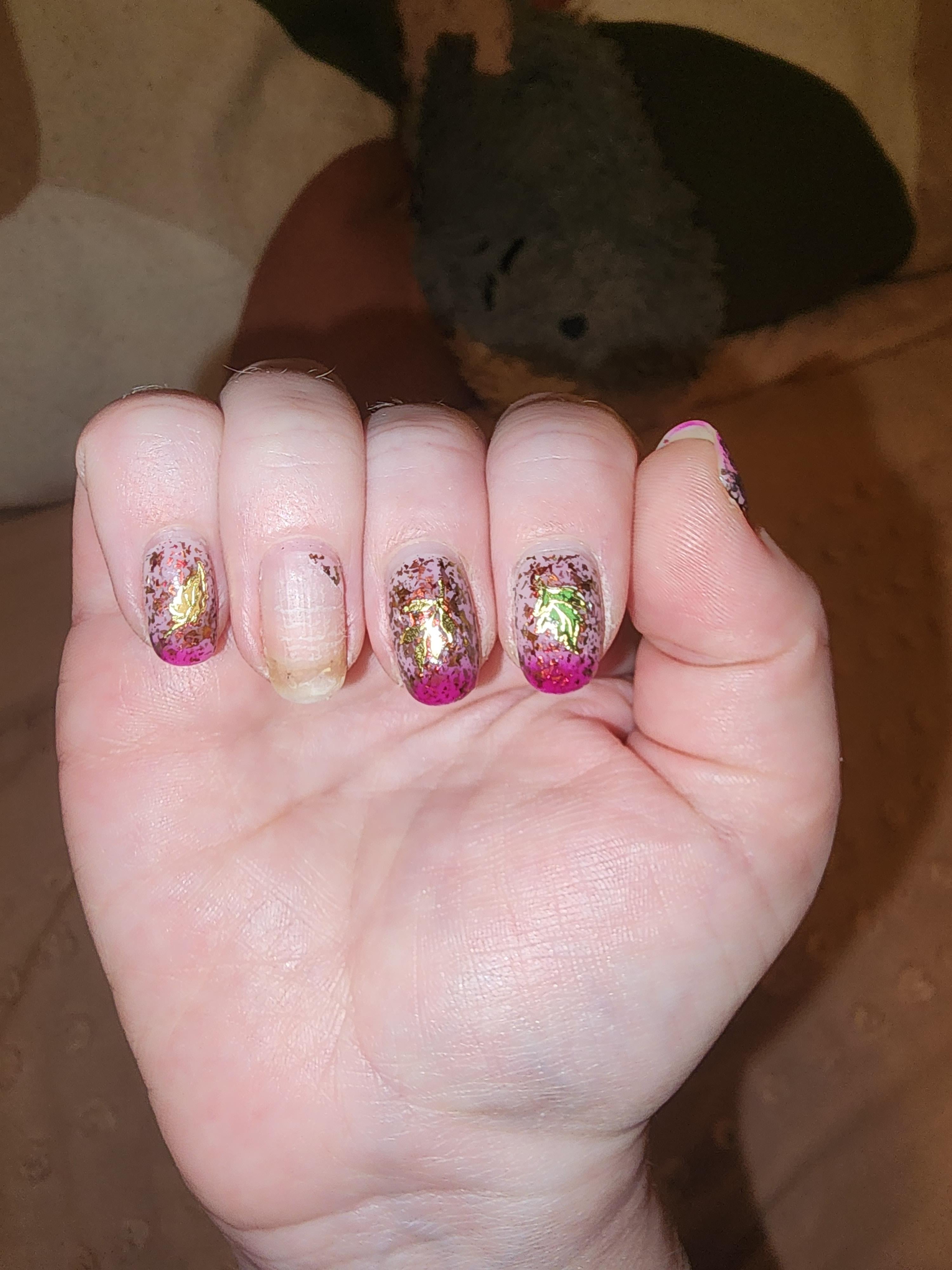 My right hand always chips quickly and I was finally rocking a week of wear. I improved my mental health today and finally made my bed and BAM lost a nail. We win some we lose some (polish)