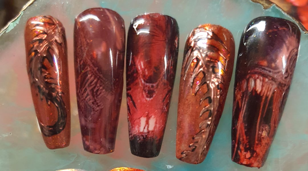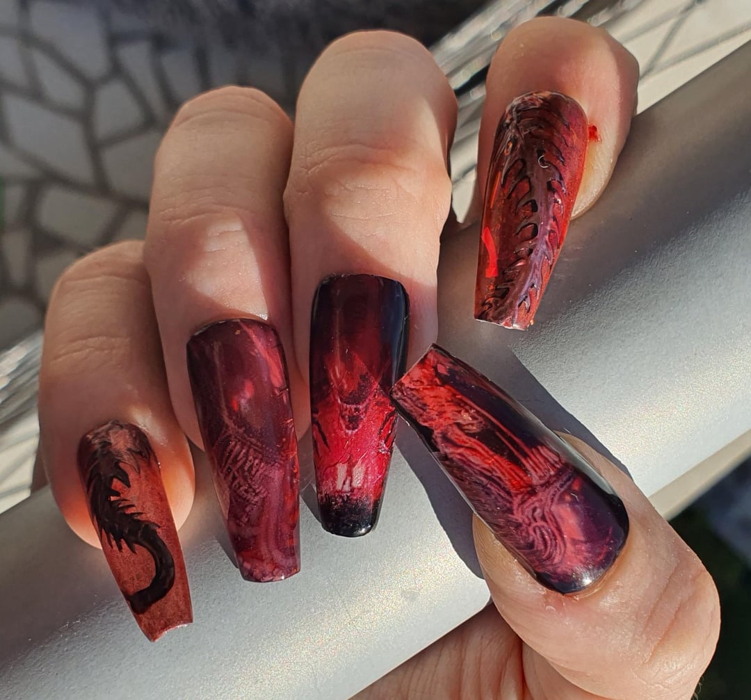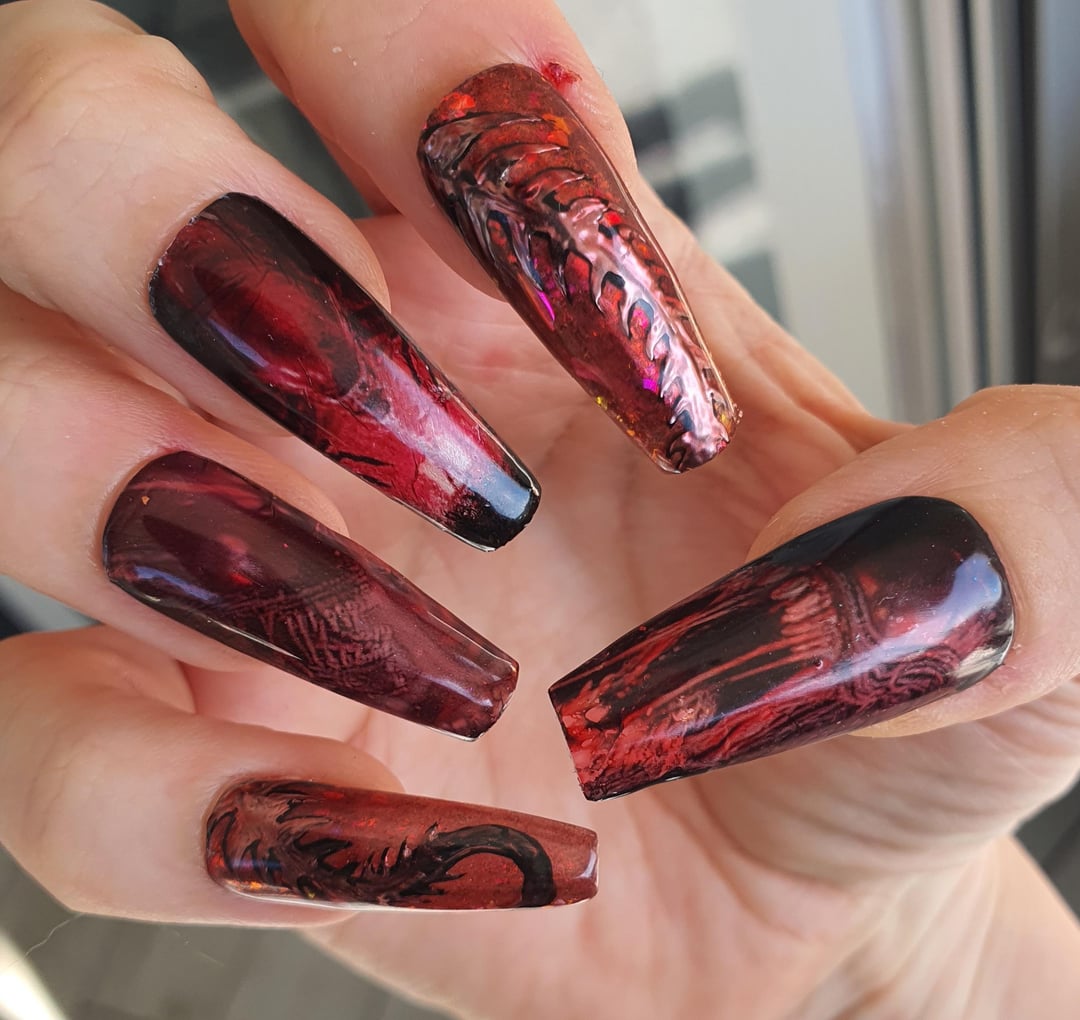 For this set, I used : – jelly red gel polish – red orange flakies – homemade alien decals – black gel paint and silver chrome Glossy top coat by Key_Opportunity_7082