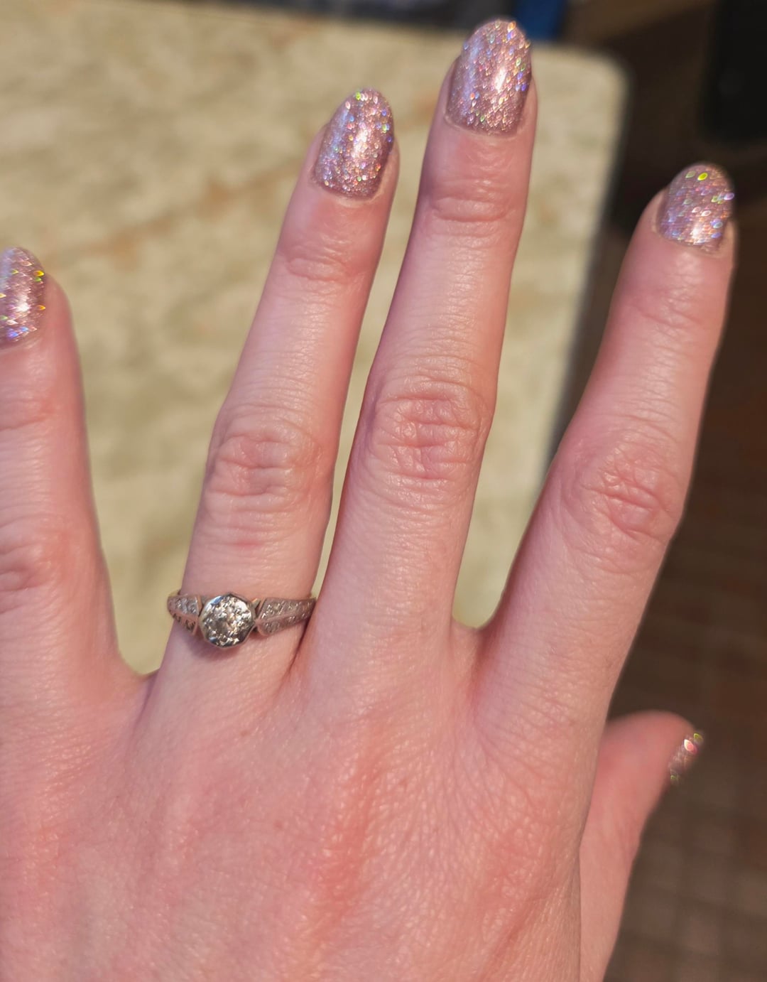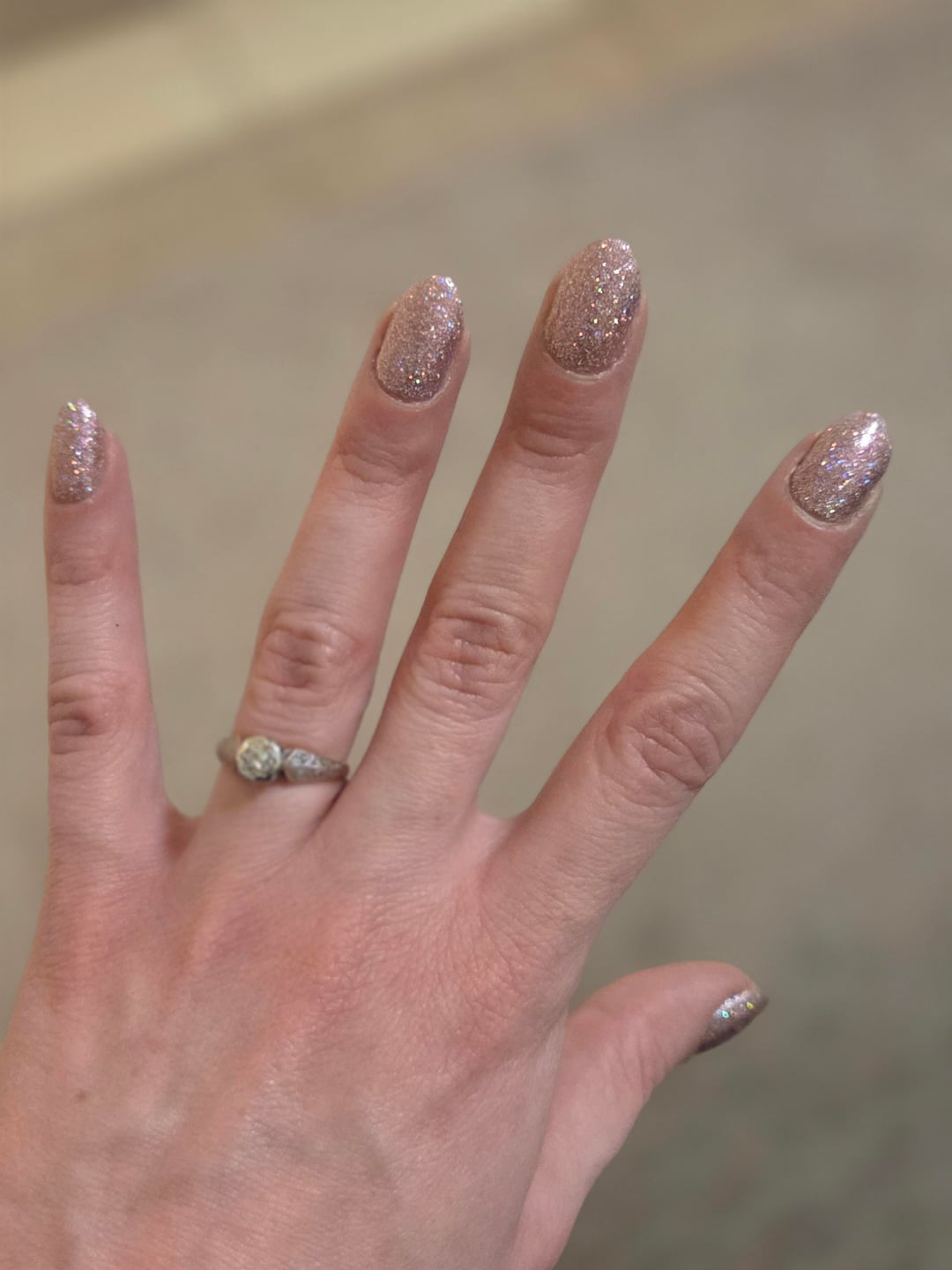 It has a very holographic sparkle in bright light, looks pure sparkling pink under darker lighting.