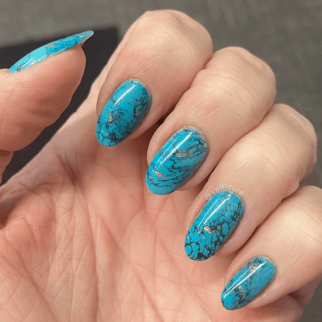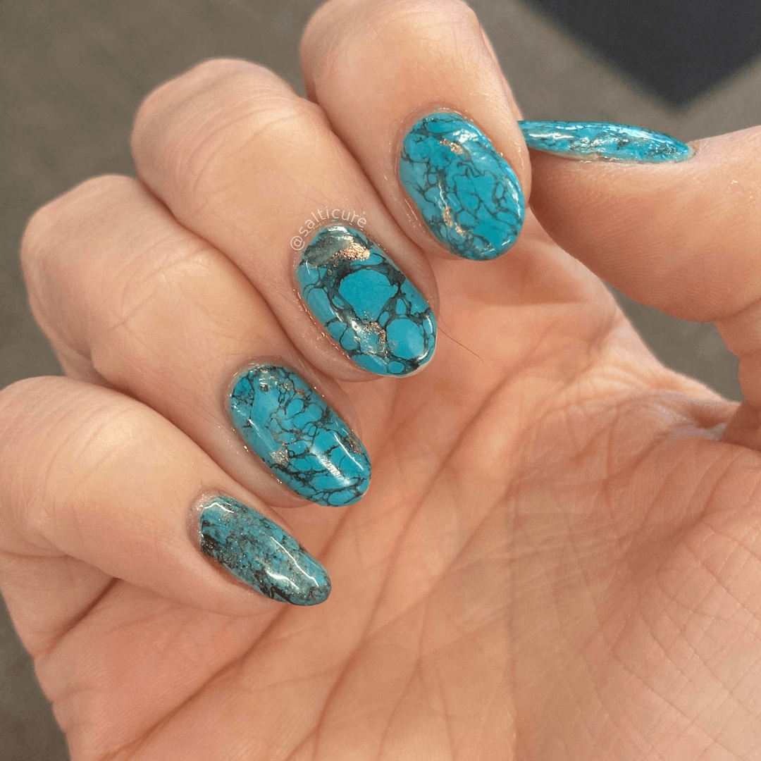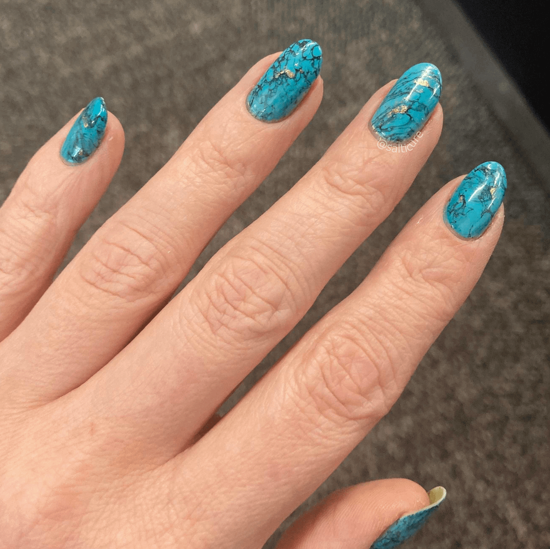 I used Rio as a base and slightly sponged on some other teals. (Too be fair, I don't know that this did much. It still basically just looks like Rio.) Then I put some drops of black in a cup with water and sprayed it with hairspray to make it spread out all funky. Dipped my finger in and then used a detail brush to add a little gold (I'm not completely satisfied with this part.)