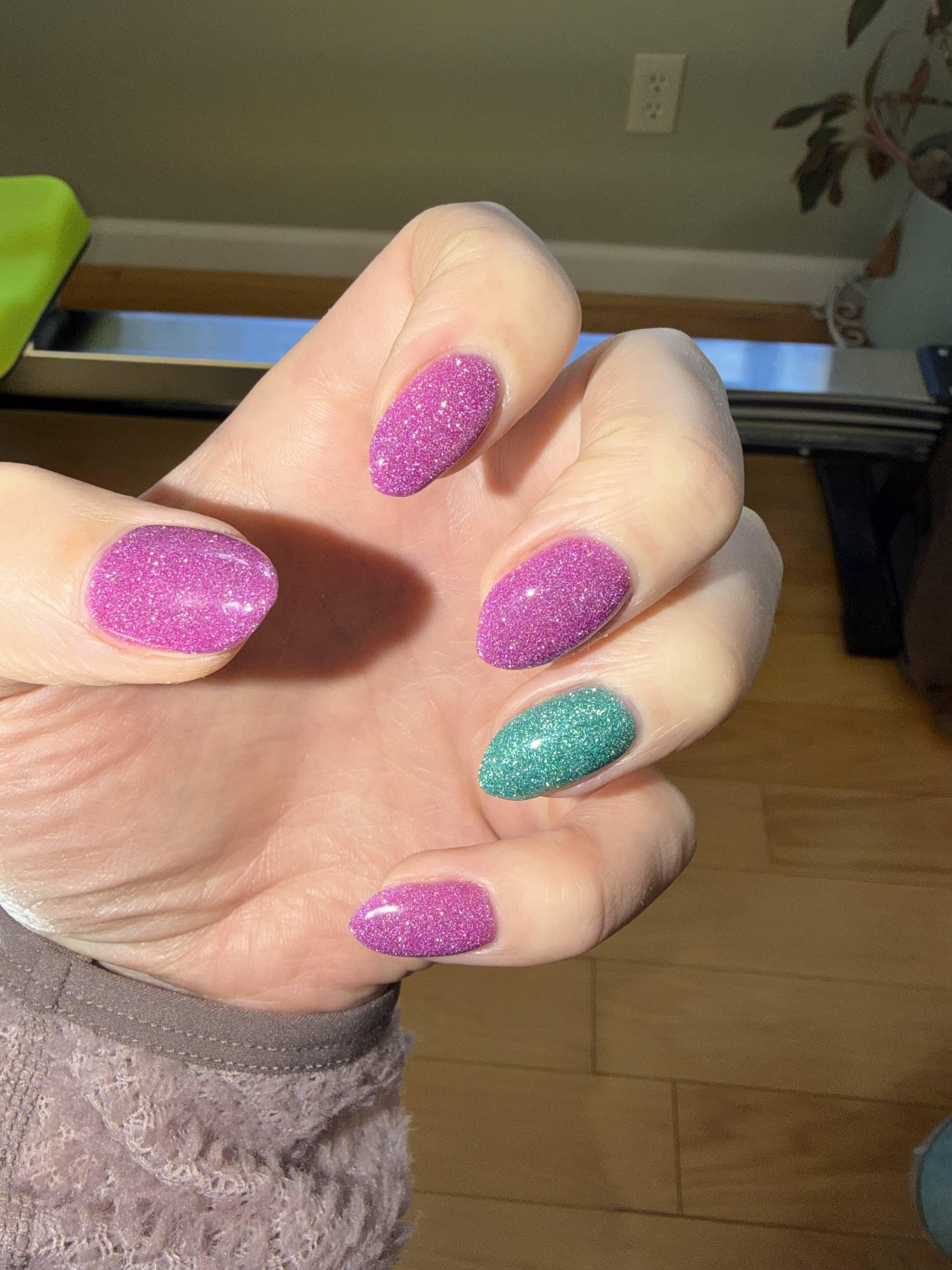 I usually do a burnt orange or neutral this time of year, but wanted something brighter. The Flash to Glam ignites under direct lighting – Gelish Flash to Glam “One Click at a Time” and “Mint to Sparkle”. Not my best at-home set but after a long time overfiling I almost have a decent free edge again!