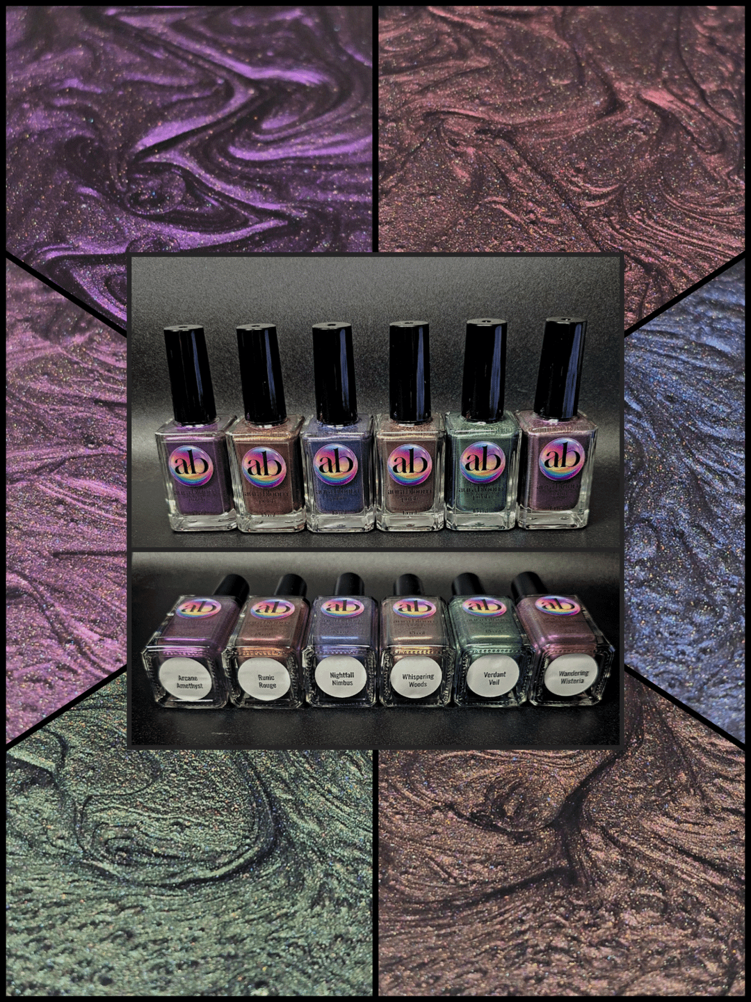 Hi! I just wanted to share our newest collection, Whispers of the Wilderness, that's available now. I've been really excited for this collection, it's like a dark autumn that transitions to winter and consists of 6 polishes that are both a linear holographic and a pearlescent polish which creates an illusionary midnight star-filled sky with a pop of pearly mystical color. They are inspired by the magical and mysterious wilderness and the secrets that it keeps at night.