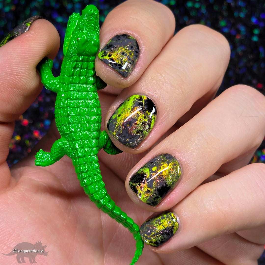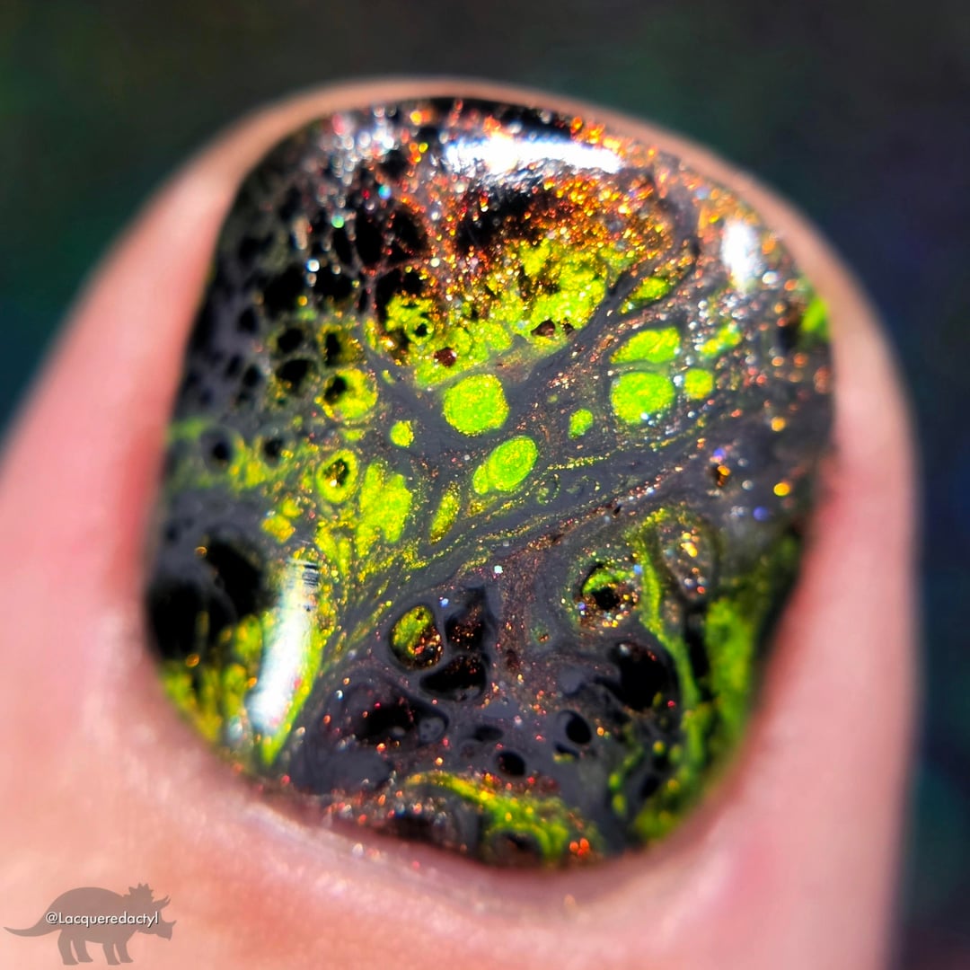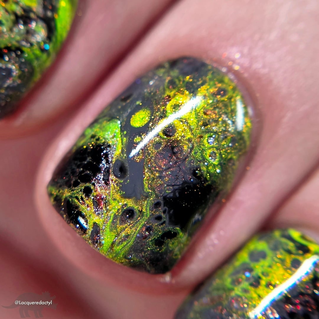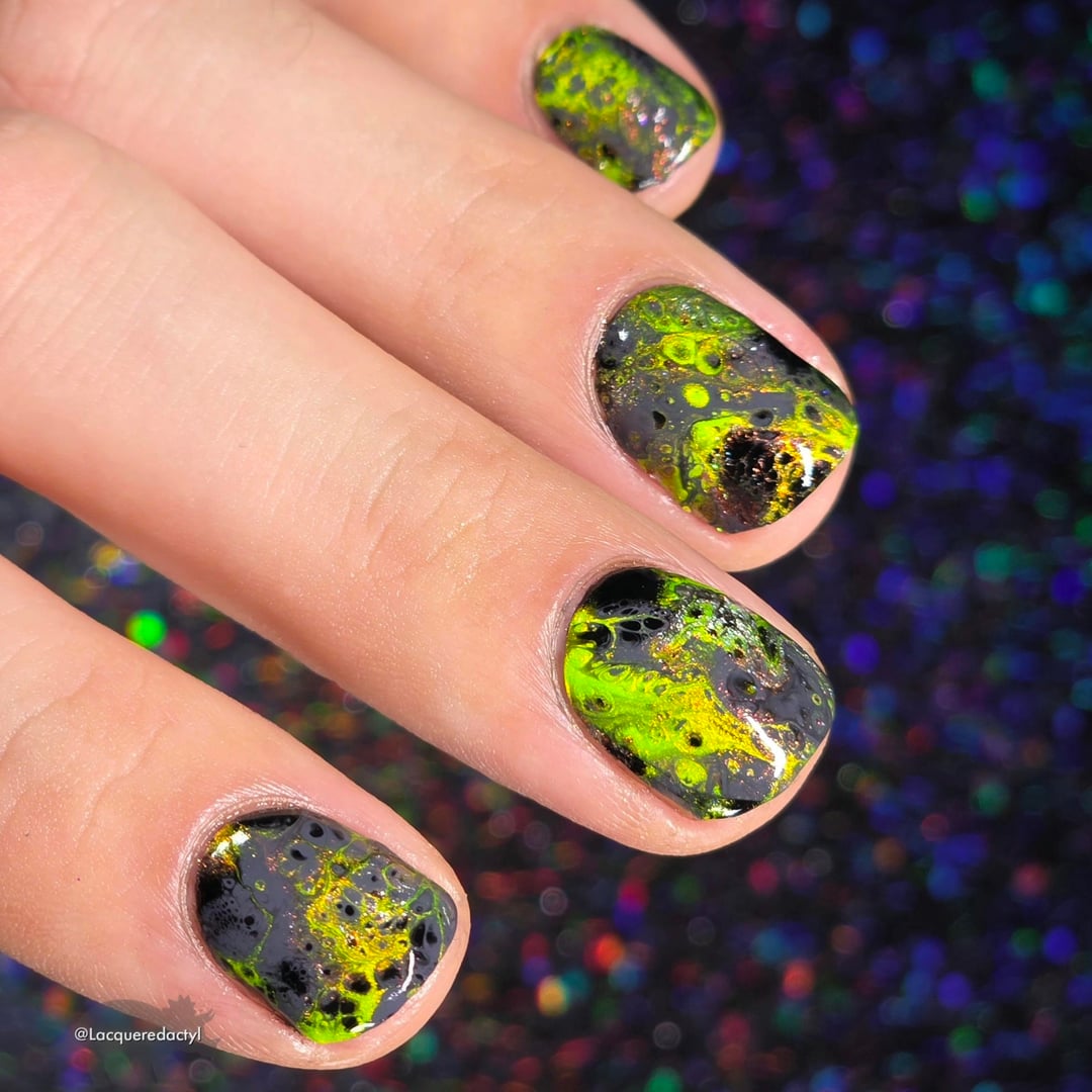 SpicyGambit on November 8, 2025 2:49 am Products used: Baroness X – Fishnets Atomic Polish – Sour Apple Rings Beaux Reveal – Star Crossed Lovers