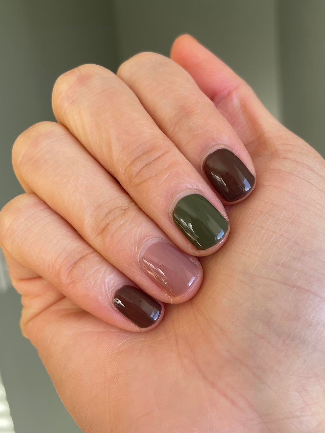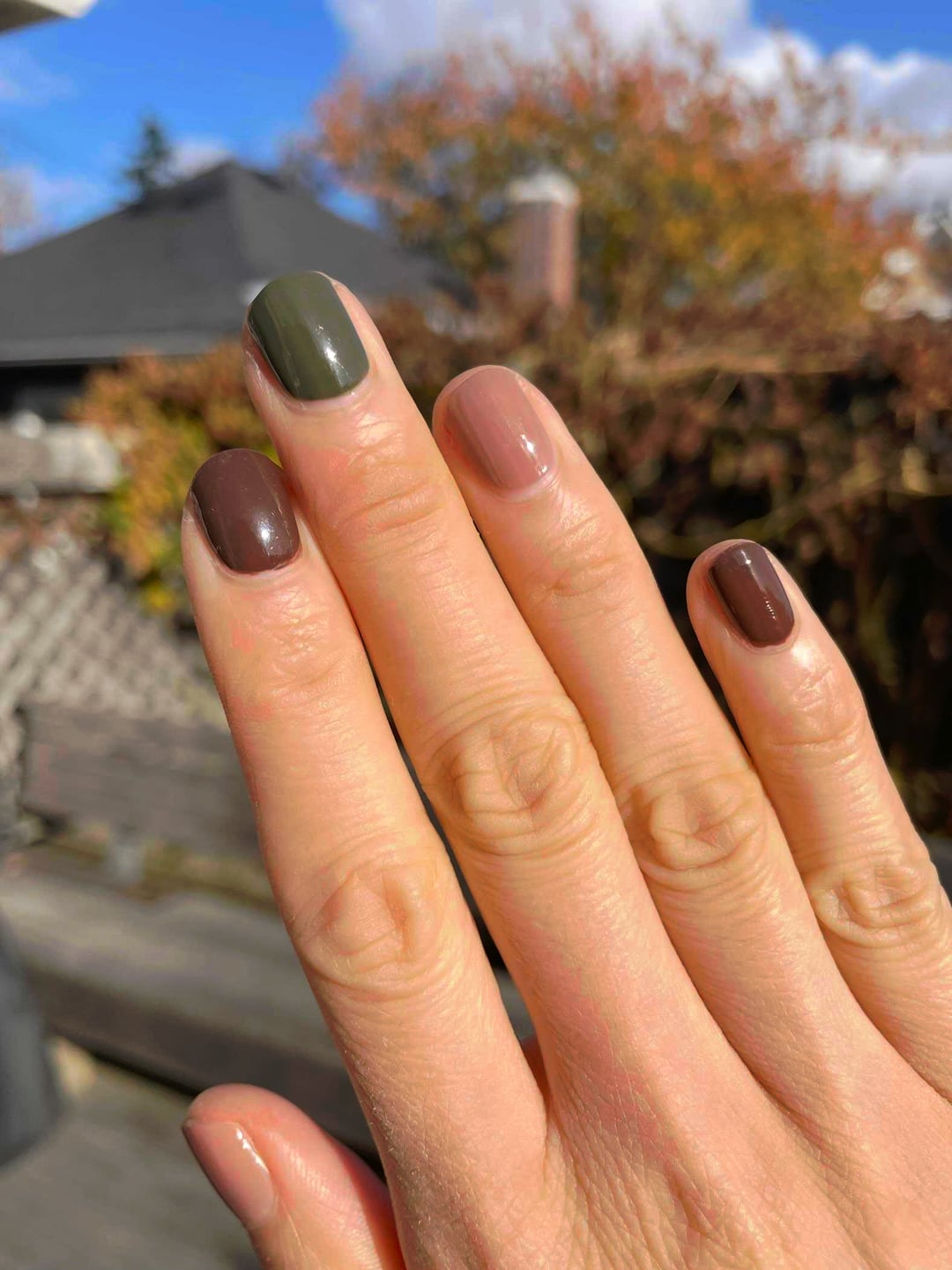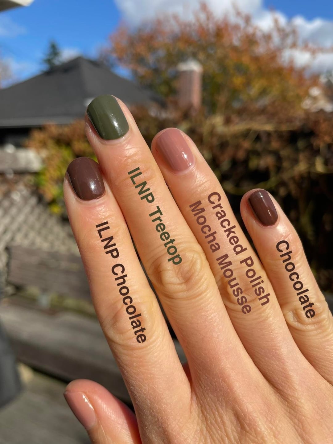 Two coats each of ILNP chocolate and treetop from last year’s campground collection, plus Cracked Polish Mocha Mousse. Cirque base/top coats.