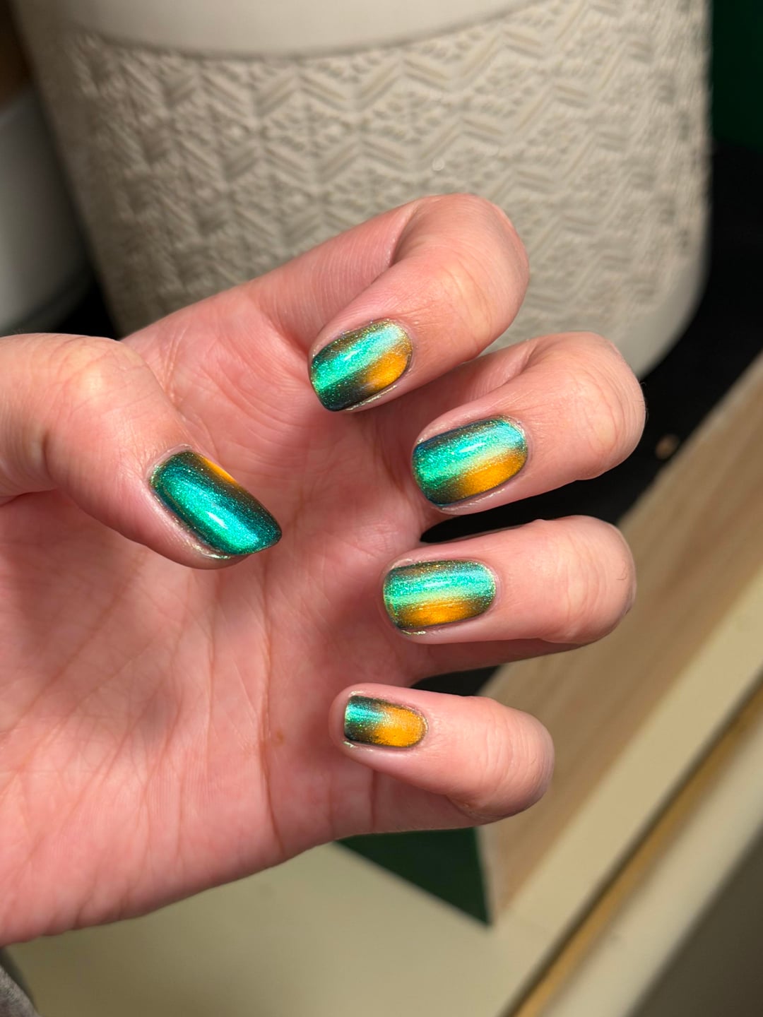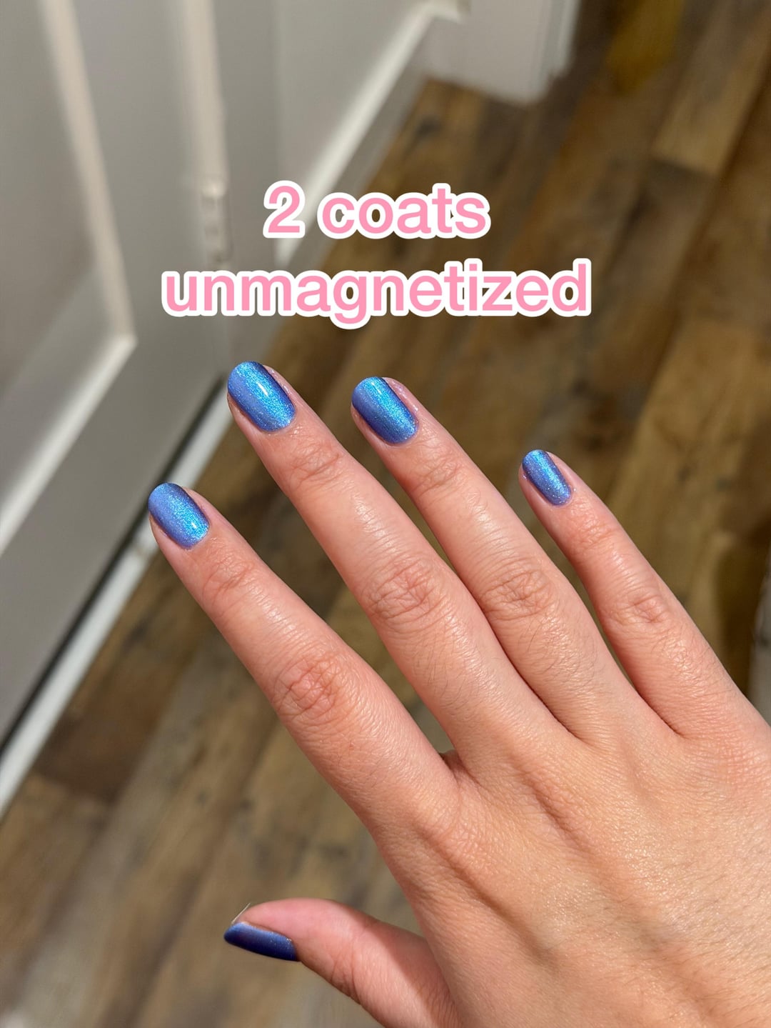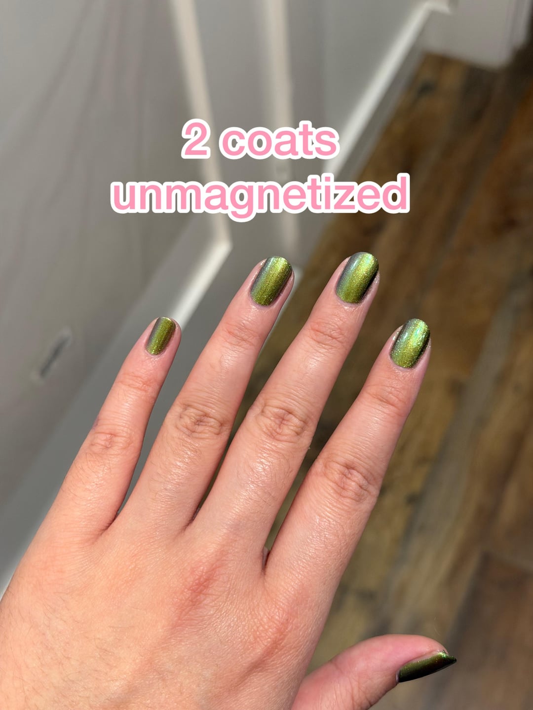 Beyond Be-leaf looked awesome on my swatch stick but I can’t get it to magnetize nicely on my own nails for some reason. It was weirdly not reactive and it will probably disperse completely overnight. It is still really pretty though, I don’t regret getting it. I will try a different magnet method next time, or maybe I need to use thicker coats.