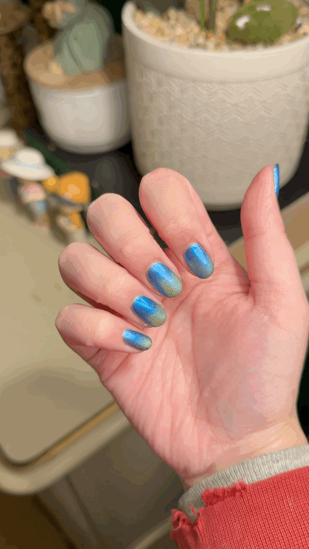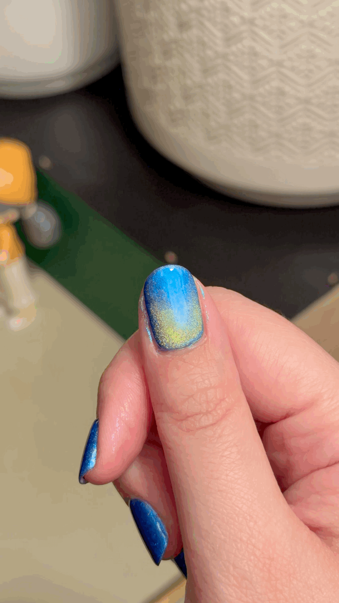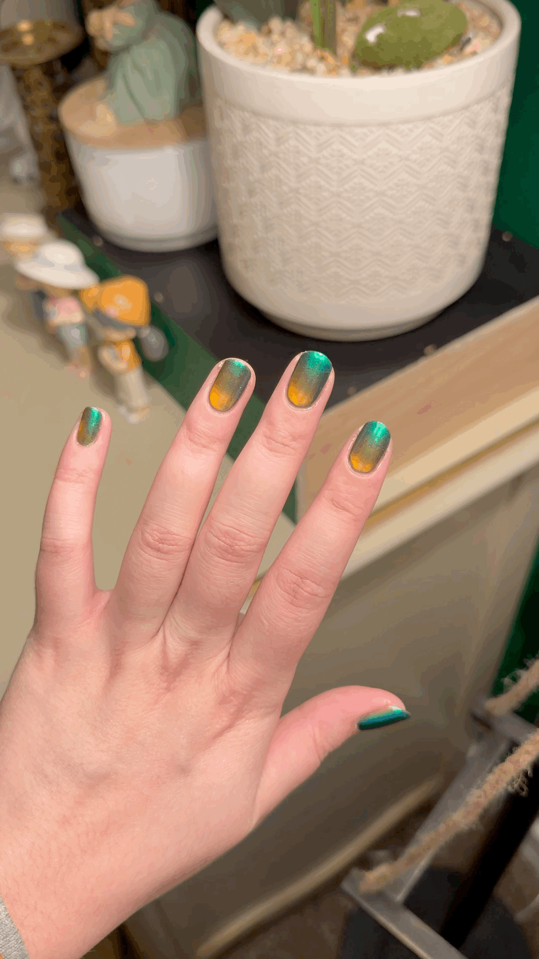 Beyond Be-leaf looked awesome on my swatch stick but I can’t get it to magnetize nicely on my own nails for some reason. It was weirdly not reactive and it will probably disperse completely overnight. It is still really pretty though, I don’t regret getting it. I will try a different magnet method next time, or maybe I need to use thicker coats.