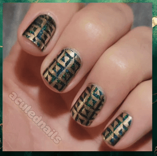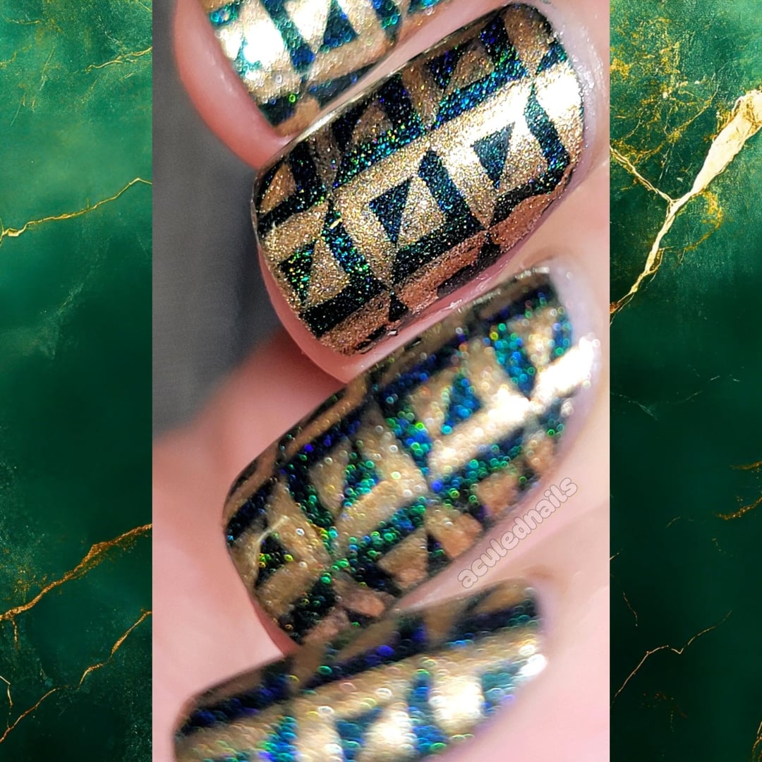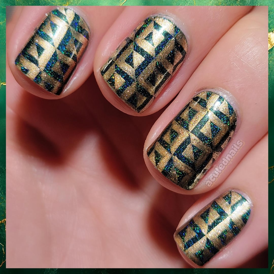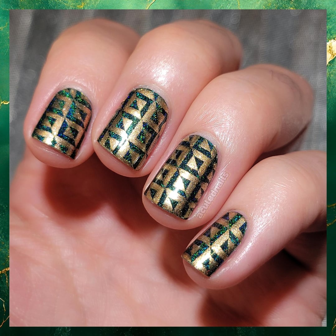 There are some color combos that live rent free in my brain permanently. One of those is emerald green and gold. I can never get enough, it's just so rich looking and perfect. Lost in the Woods is such a gorgeous Emerald because that linear holo pigment leans it cooler. I wanted a kinda art deco-ISH pattern…somewhat Emerald City coded, but graphic and not ornamental feel…and ended up with this fun stamp triangle pattern. Cleaning it up Freehand with a brush after stamping helps crisp up lines, and I am chuffed to bits with how it came out! I feel like a CLASSY bitch.