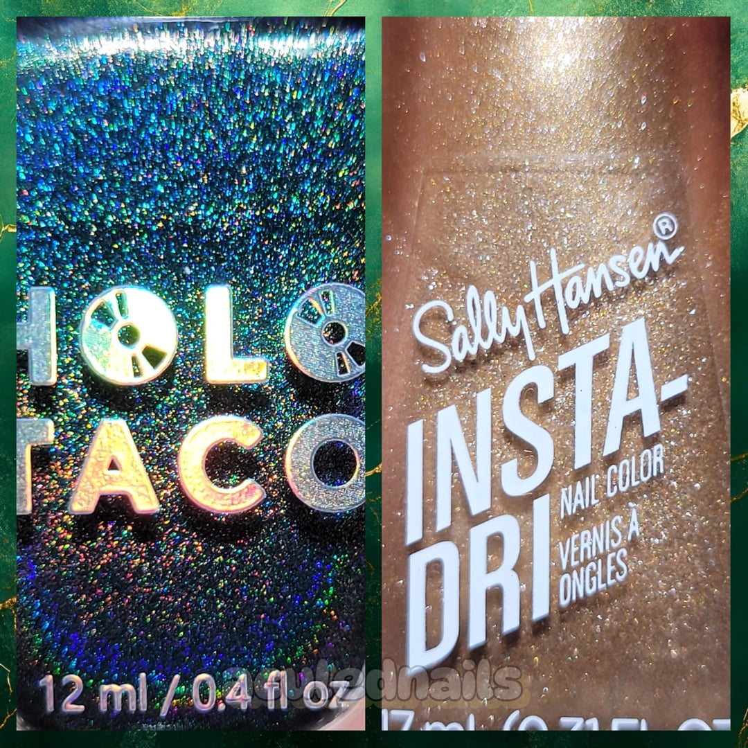 1. There are some color combos that live rent free in my brain permanently. One of those is emerald green and gold. I can never get enough, it’s just so rich looking and perfect. Lost in the Woods is such a gorgeous Emerald because that linear holo pigment leans it cooler. I wanted a kinda art deco-ISH pattern…somewhat Emerald City coded, but graphic and not ornamental feel…and ended up with this fun stamp triangle pattern. Cleaning it up Freehand with a brush after stamping helps crisp up lines, and I am chuffed to bits with how it came out! I feel like a CLASSY bitch.