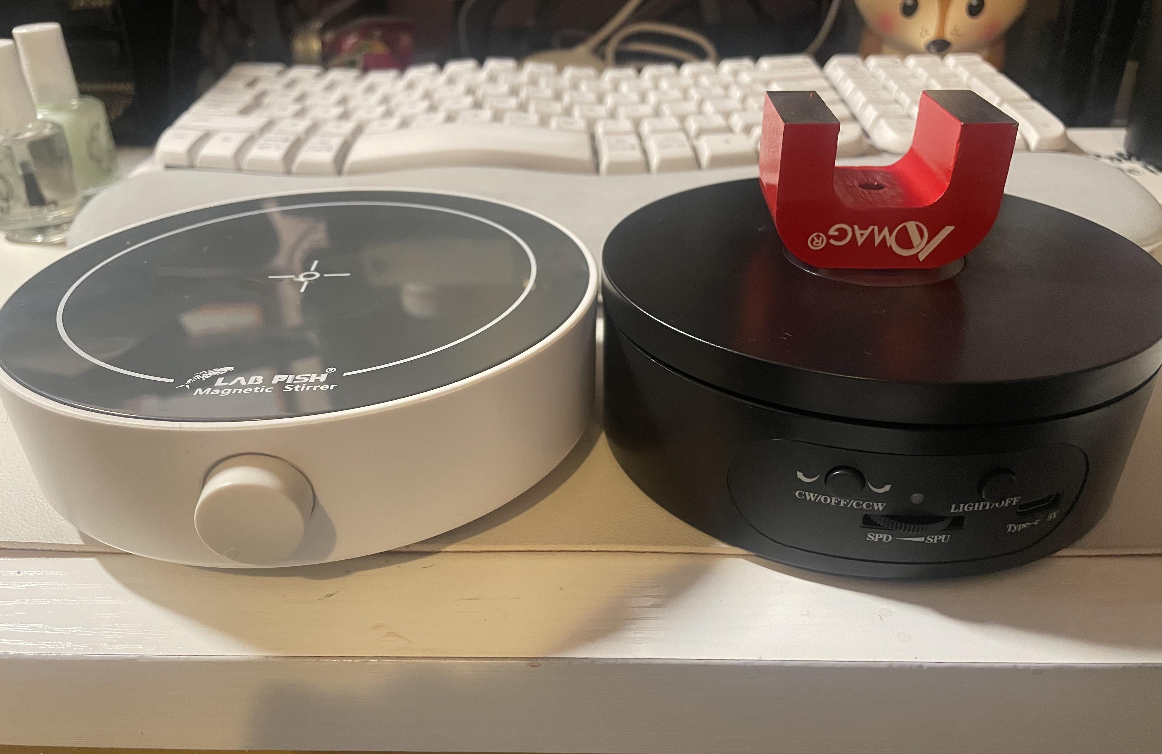 The lab stirrer does not have a strong enough magnetic pull to do a crisp super glassy glass bead. The spinners from Etsy do, but you have to manually spin them the entire time. A motorized rotating display stand paired with a 30 lb horseshoe magnet gives you the strong magnetic pull combined with the laziness of the lab stirrer.