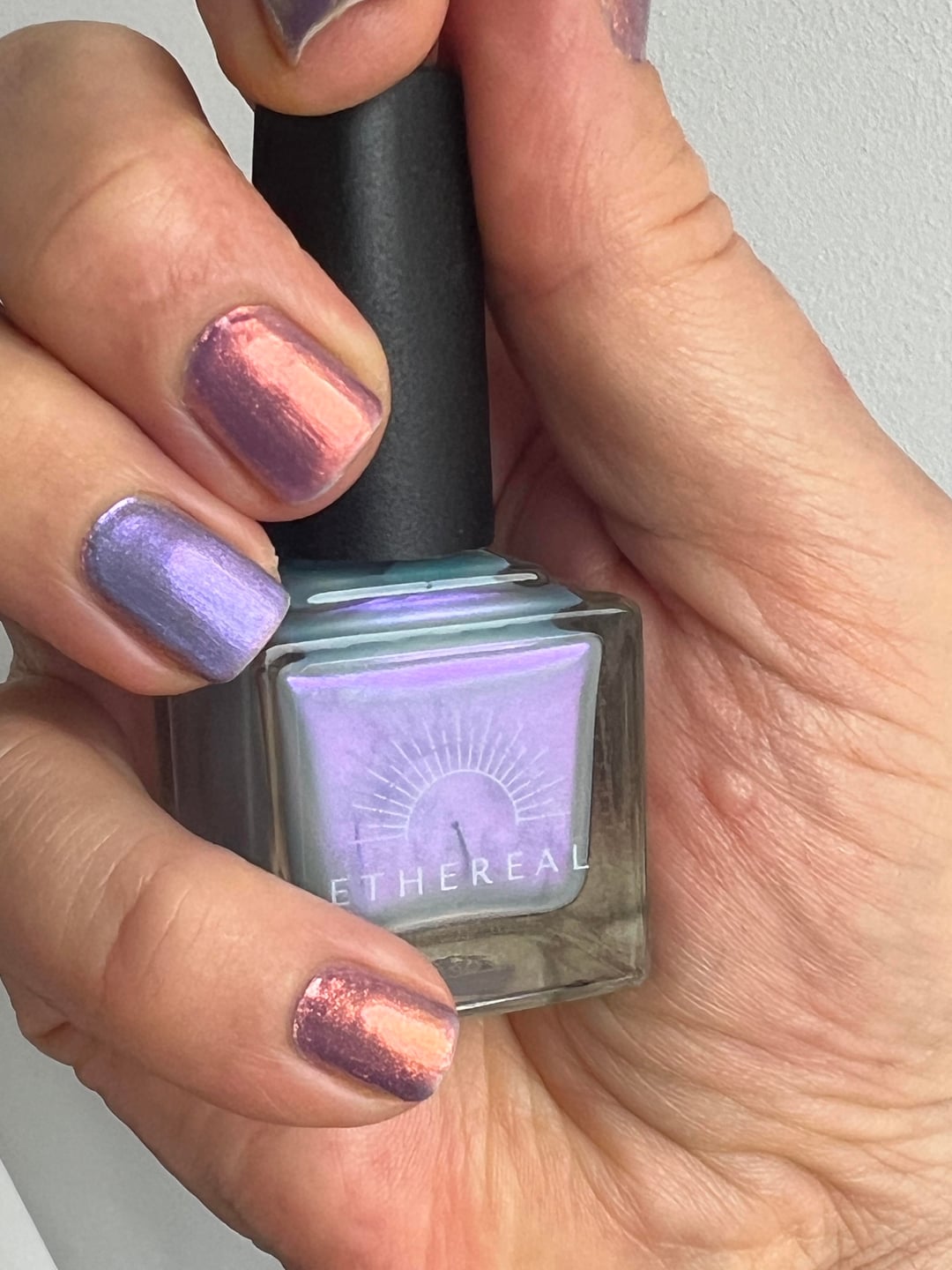 I just bought this stunning polish on Vinted and I feel so lucky! I love it! It seems to be a prototype by Ethereal Lacquer called "Ariel". The very nice girl who sold it says she bought it at nailland.hu as a mystery polish. Now please teach me about that mystery polish thing. When is it? How often is it? How can I get my hands on more mystery? I just quickly threw one coat on one finger over Take me to your Leader by Mooncat. Does this one look like it might be an earlier version of Haunted Polish's Ghostly?