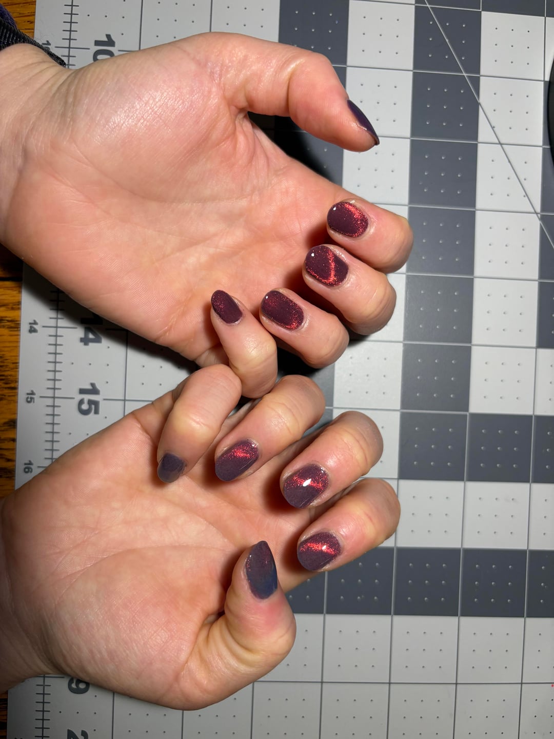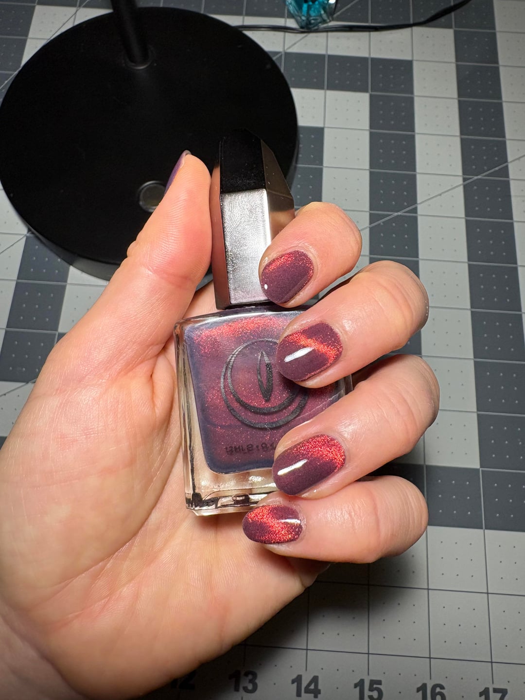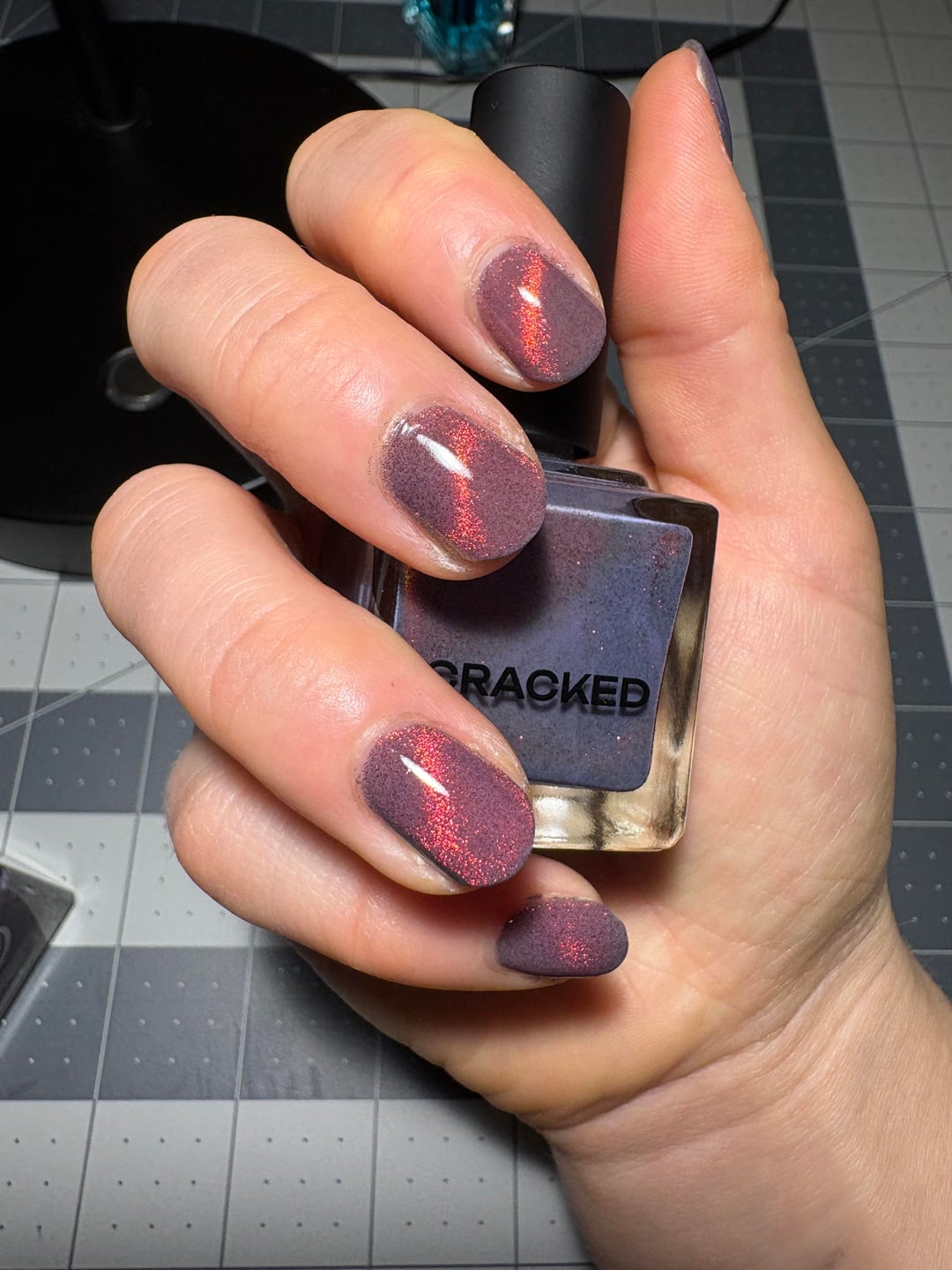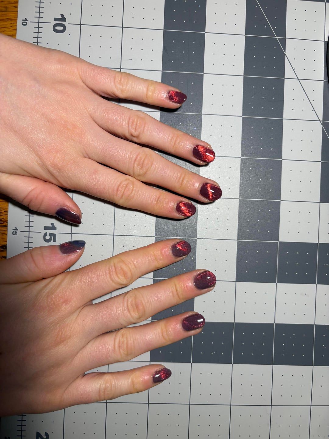 Right hand: three coats Cracked Lahar, magnetized using horseshoe/bar, and one coat ILNP Glass Candy