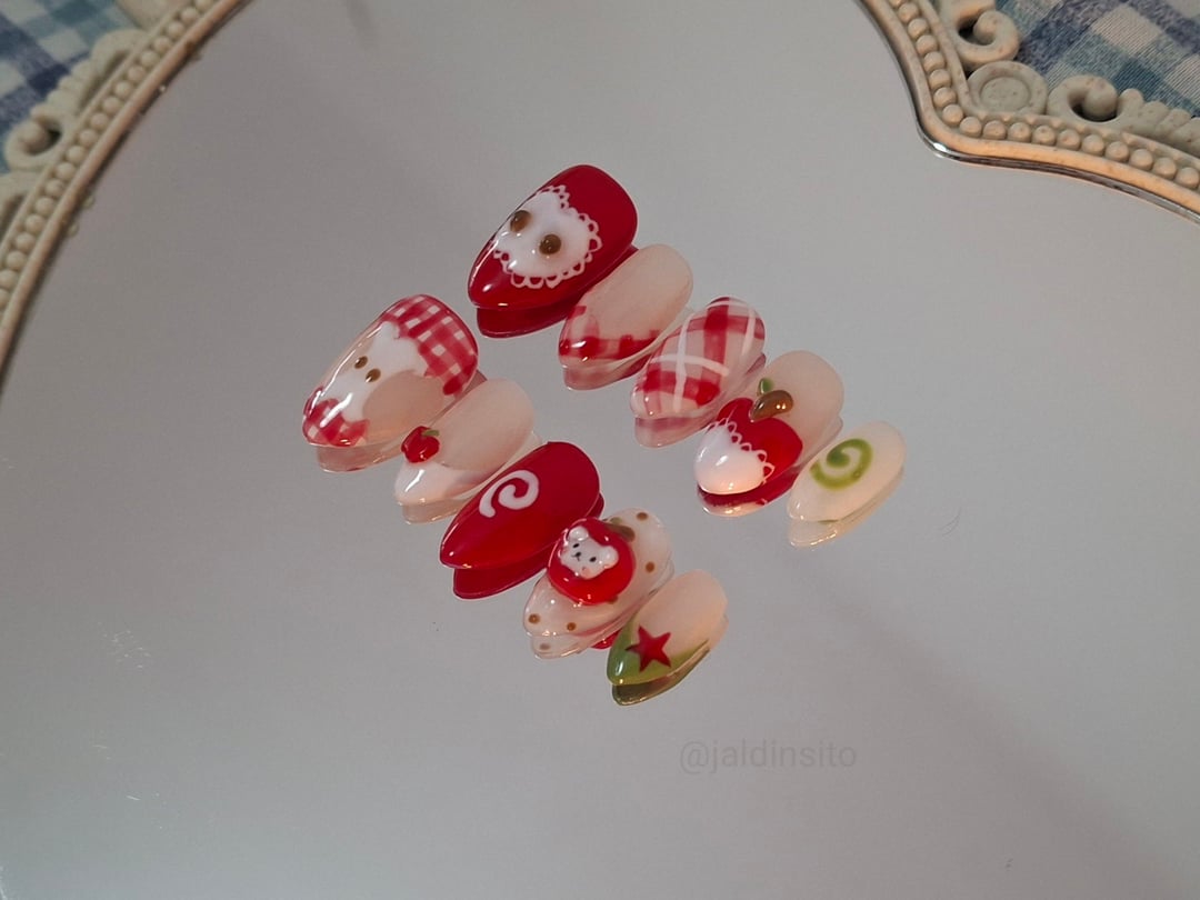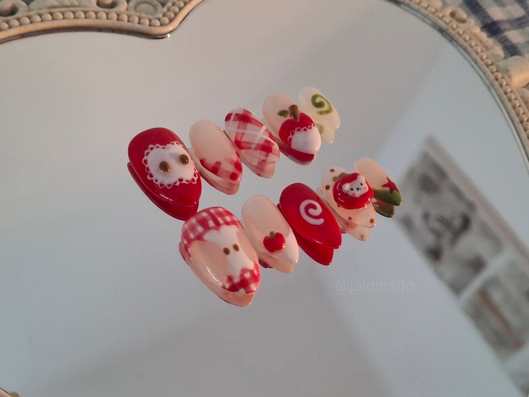 So I yesterday made this super cute apple inspired nails and finished by 5 am. I think I started doing them at 11pm(? My back did hurt a lot but I went to bed super proud for these! Let me know what you think and if it was worth it! by jaldinsito