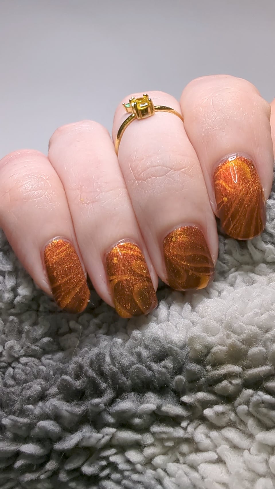 Linry on November 11, 2025 3:09 pm [PR] Disclosure: I did receive some of these polishes in PR. With no obligation to post/share my swatches. Products used: Top Coat: [PR] tylers trinkets: quick dry topcoat Base coat : Home made peel off base, seche clear polish reweter? idk what to call this lol it rewet the polish so I could velvetzise the polish [PR] tylers trinkets: magnetic elixir ILNP: amber [PR] tylers trinkets: bloodmoon outlaw