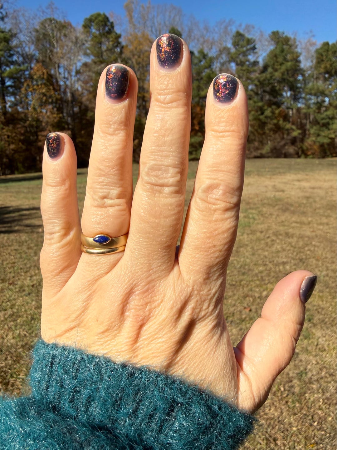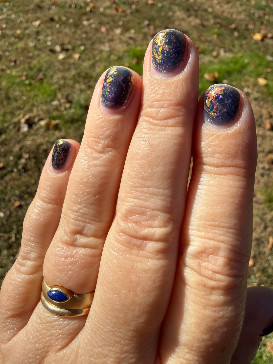 It’s kinda what I was hoping Mooncat Pangea would be—with a matte topcoat, it would be Pangea’s more voluptuous older sister! Positively jammed with shimmering, gorgeous flakies. It seems made for the golden autumn sunlight.