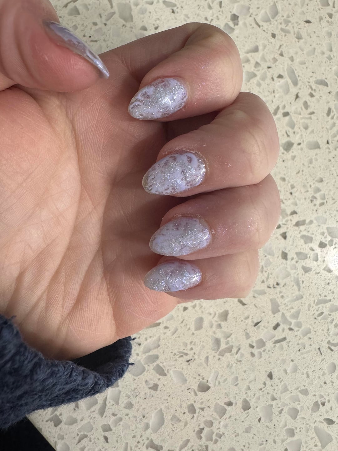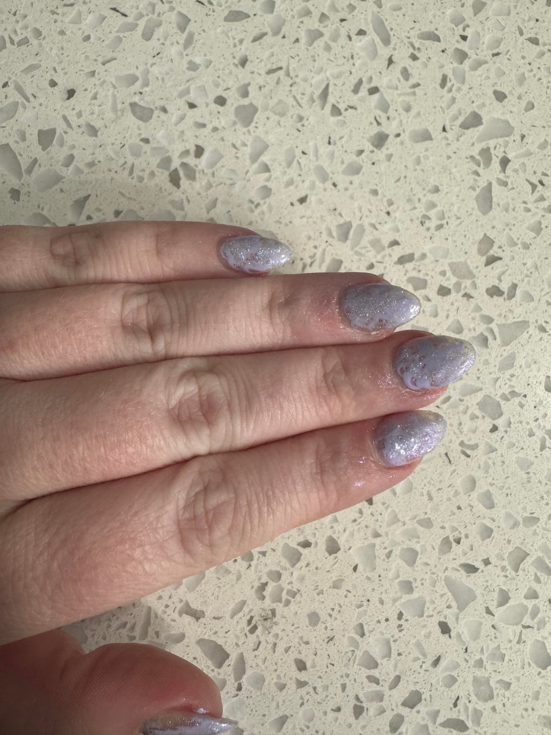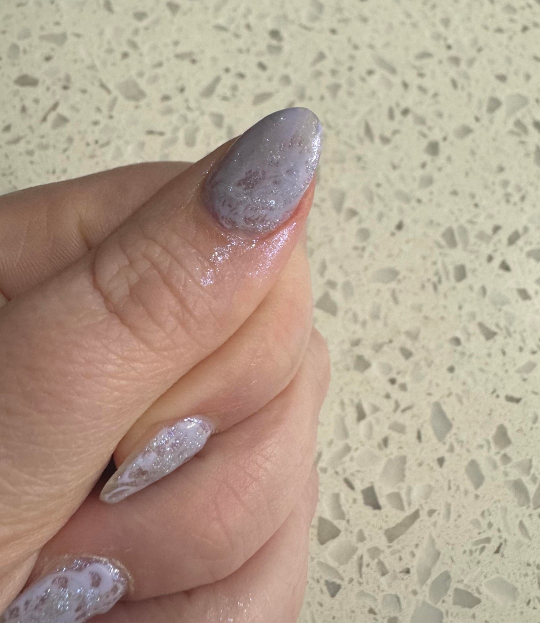 They tried to do the design without the right type of polish. The set in your photo is easily achieved by swirling pearlescent polish. Not glooping a colour over glitter because that is an abomination and you need a refund.
