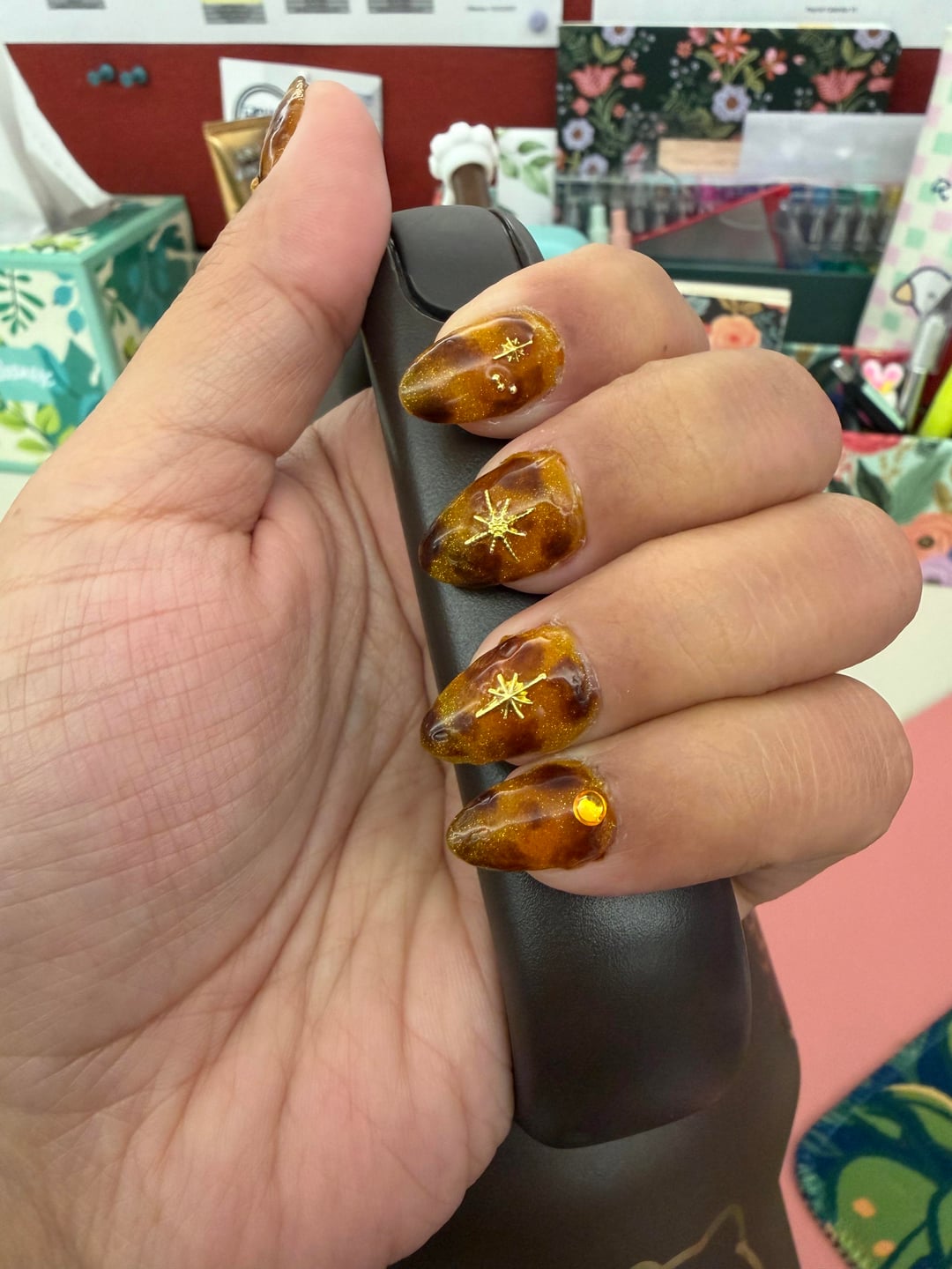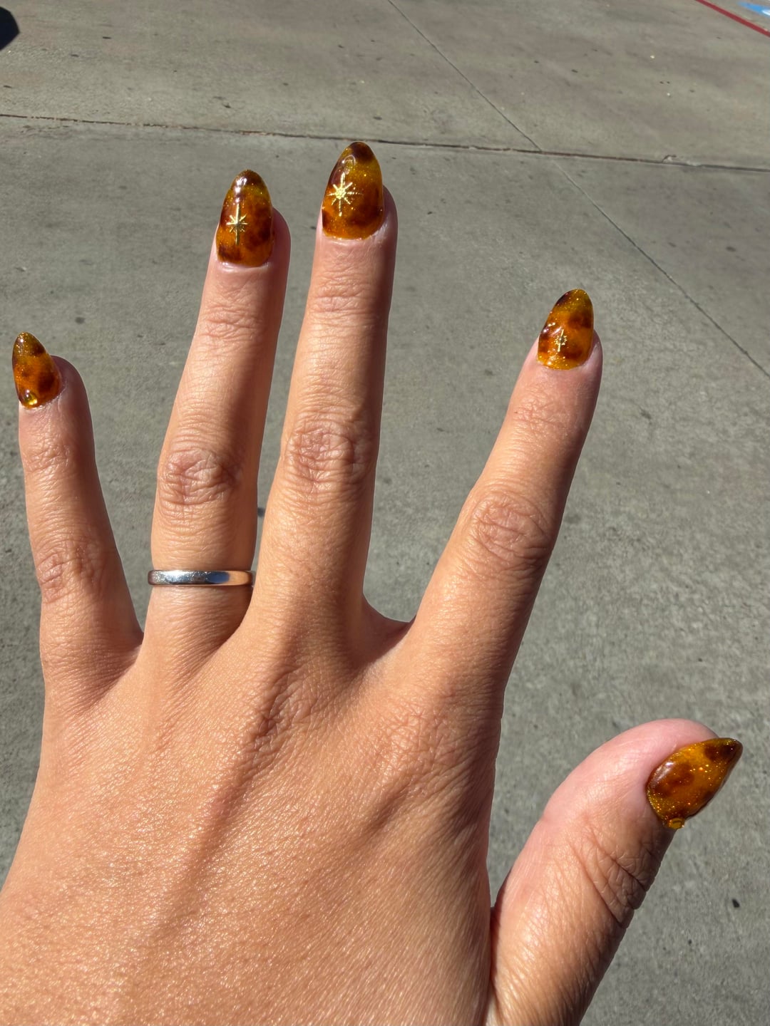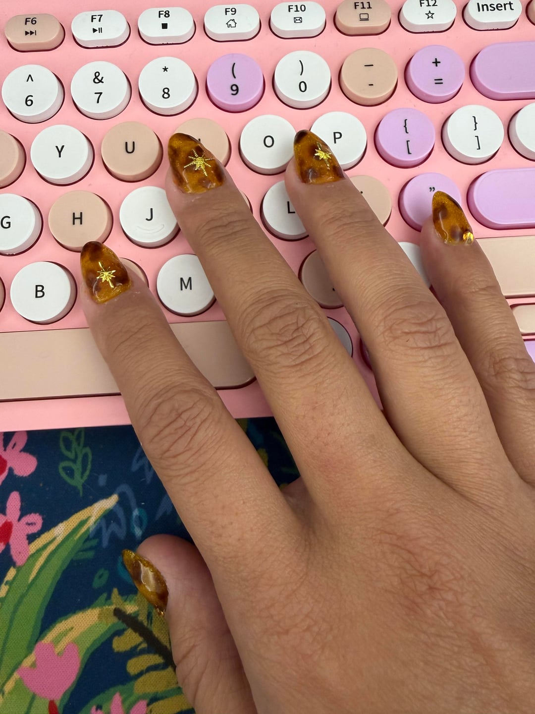 My first attempt at the technique of tortoise shell nails and it was so much fun! The maximalist in me had to add a glitter base and gold accent charms, but I am OBSESSED! 🤩