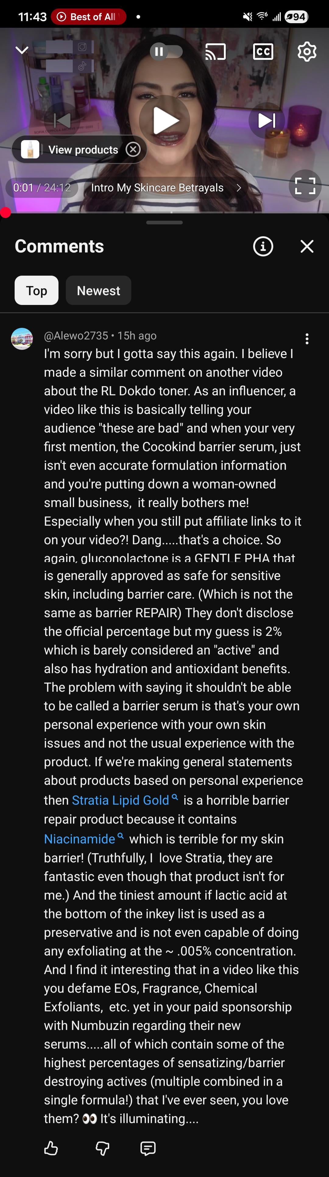 I've been watching Kelly Driscoll for a bit now because I liked her focus on barrier care and not just promoting trendy crap, but the last 6 months of so more of her videos are paid sponsorships and she's clearly stopped caring about honest reviews and is dragging products for asinine reasons like she's an ingredient reading expert. This was my comment on her recent video and I unsubscribed….😤
