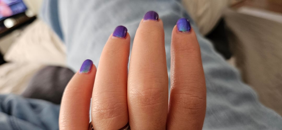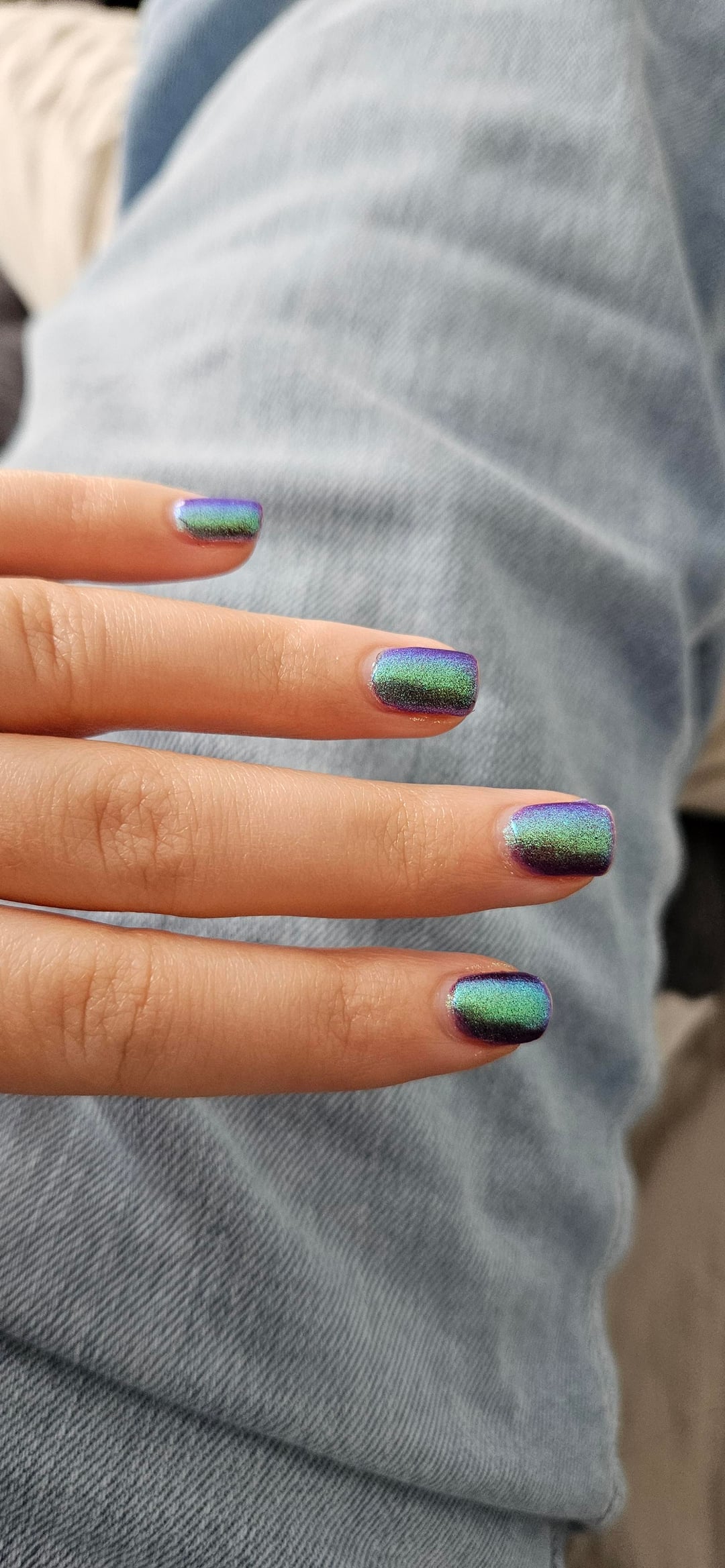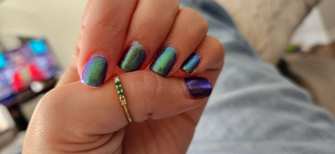 Nearing the end of my Cock A Doodle Doom Mani and I decided to top it with LSD both by Sassy Sauce polish. Turned out really cool! Matches my emerald ring.