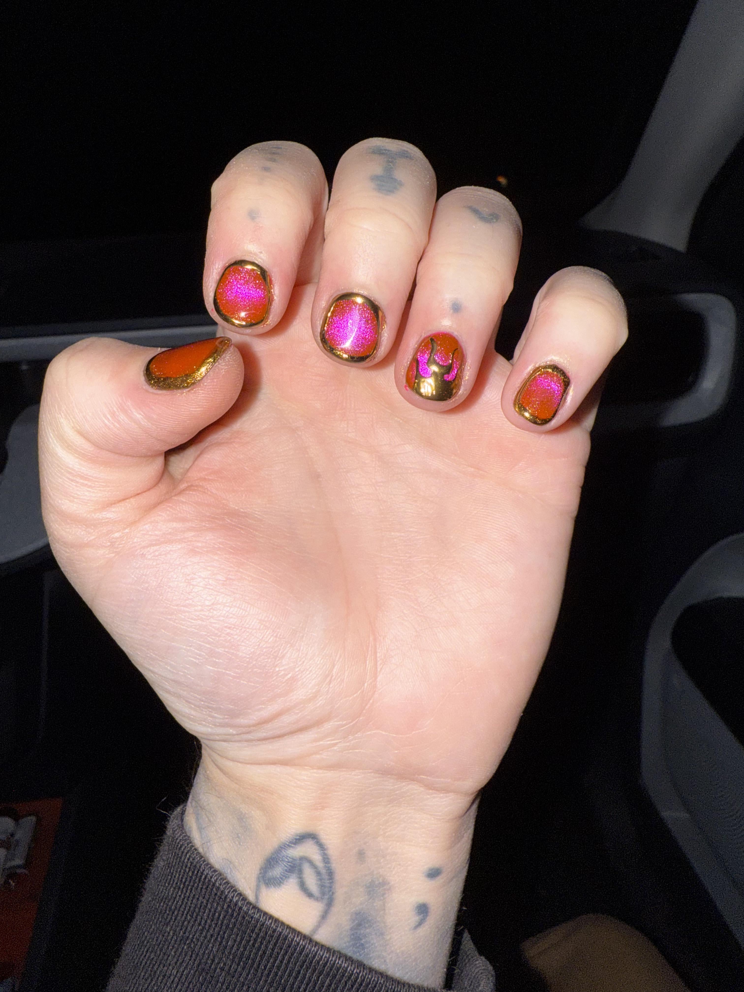 I got hot pink gel cat’s eye with a chrome outline on each nail except my ring fingers which I got chrome flames on! Now I’m going to go with my wife when she goes for her fills!!