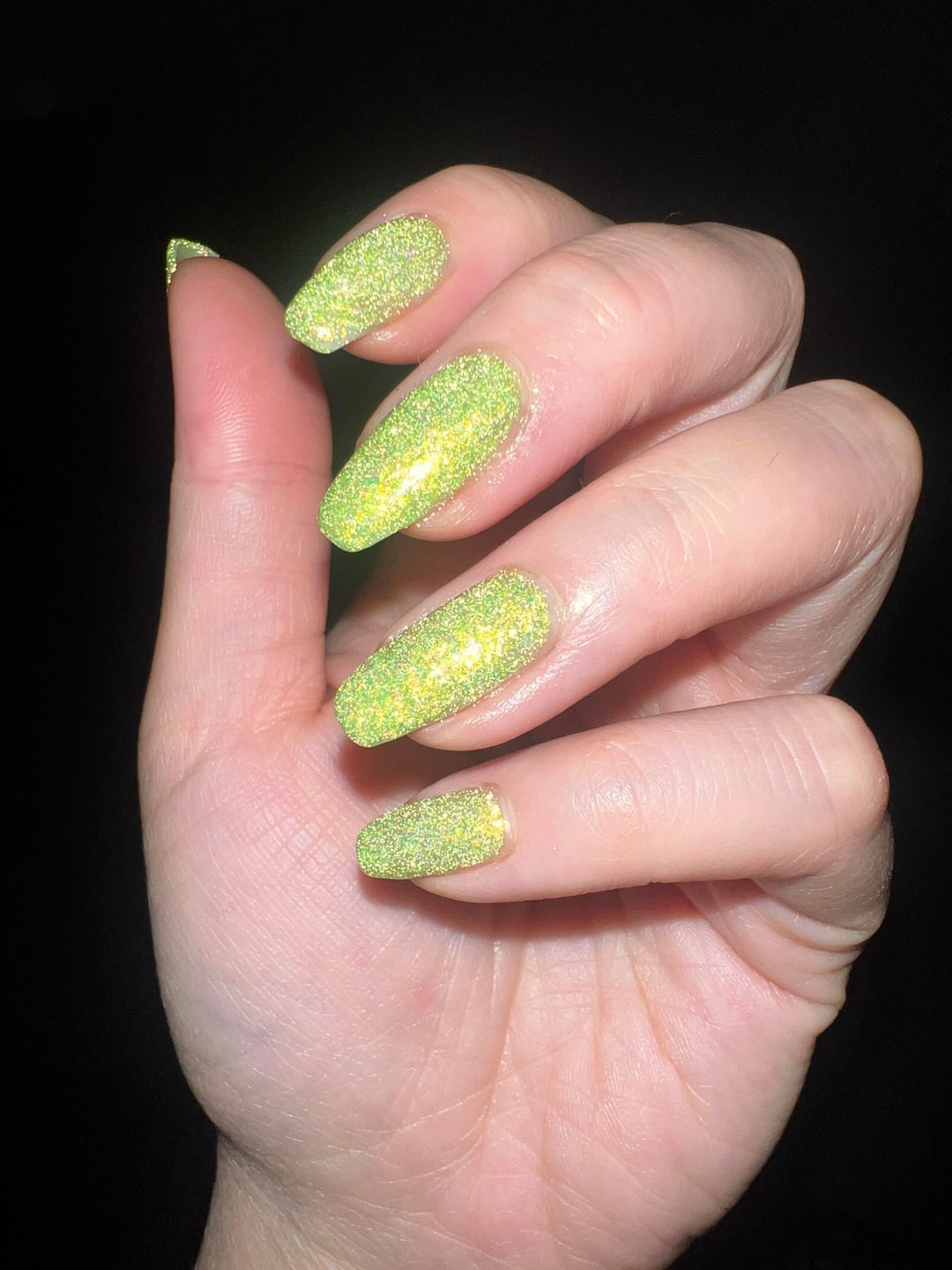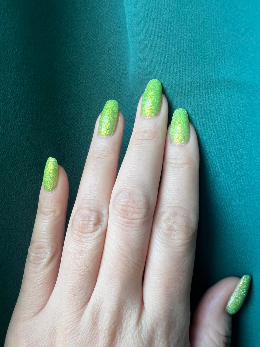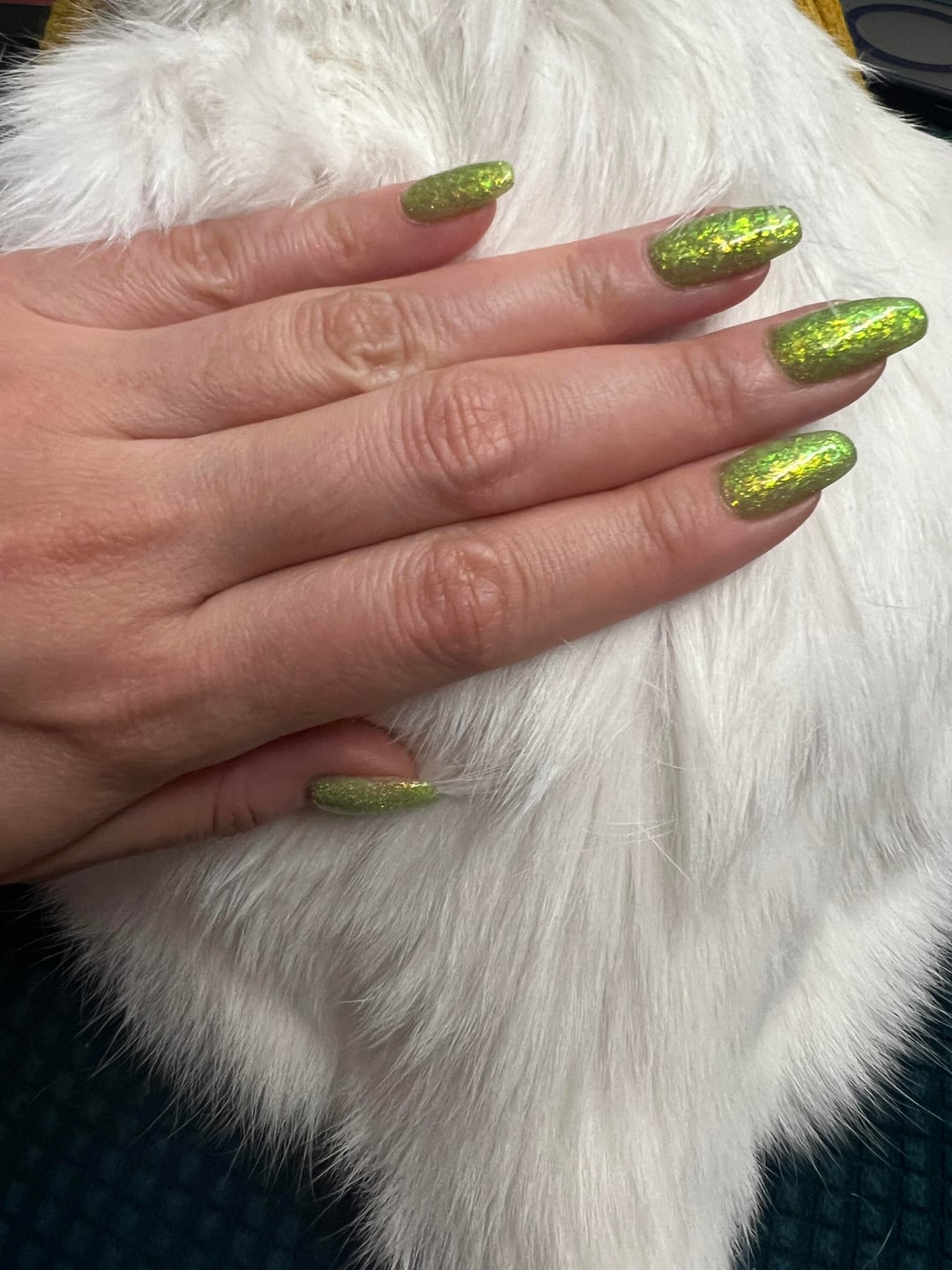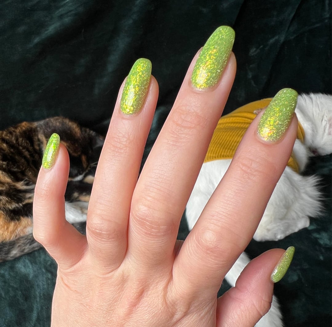 Tried to catch in different lighting + my gatos😆…1x Orly bonder x2 LURID Indoor Cat with Outdoor Dreams x1 Glisten and Glow Glitter Grabber x1 Cuticula QTDC ***I also used a thin a layer of builder gel on each nail due to some recent breakage.