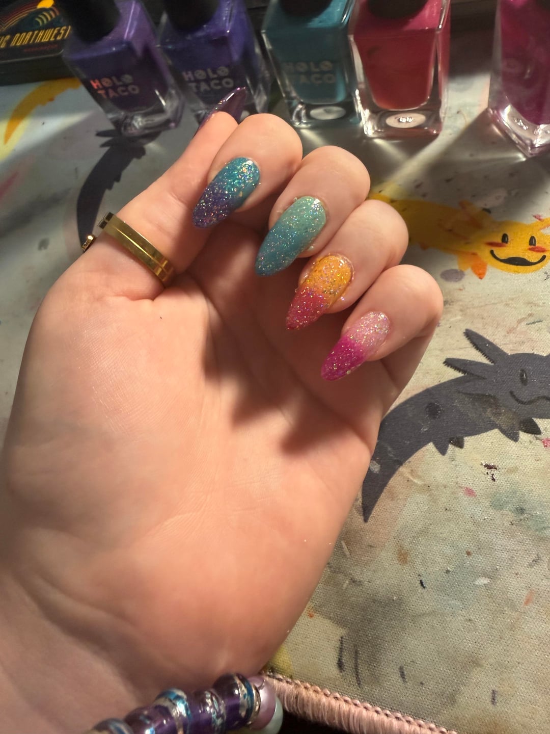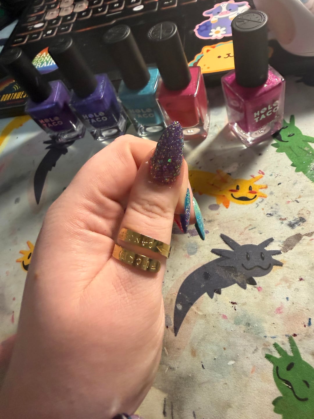 anniewhovian on November 13, 2025 12:13 am – beetles medium almond half matte full cover nail tips – beauty secrets nail glue – seche clear base – thumb: holo taco guilty pleasure thermal – index: holo taco simply chaotic thermal – middle: holo taco funny feeling thermal – ring: holo taco rage bait thermal – pinky: holo taco deeply superficial thermal – topper: holo taco everything taco – seche vite quick dry top coat