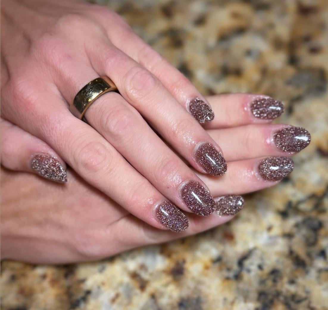 My 12 year old has taken interest in nails. We have started with some cheaper options such as an entire nail instead of tips+acrylics & some UV nail polish from a brand found on Amazon. This is a brown glitter from Beetles.