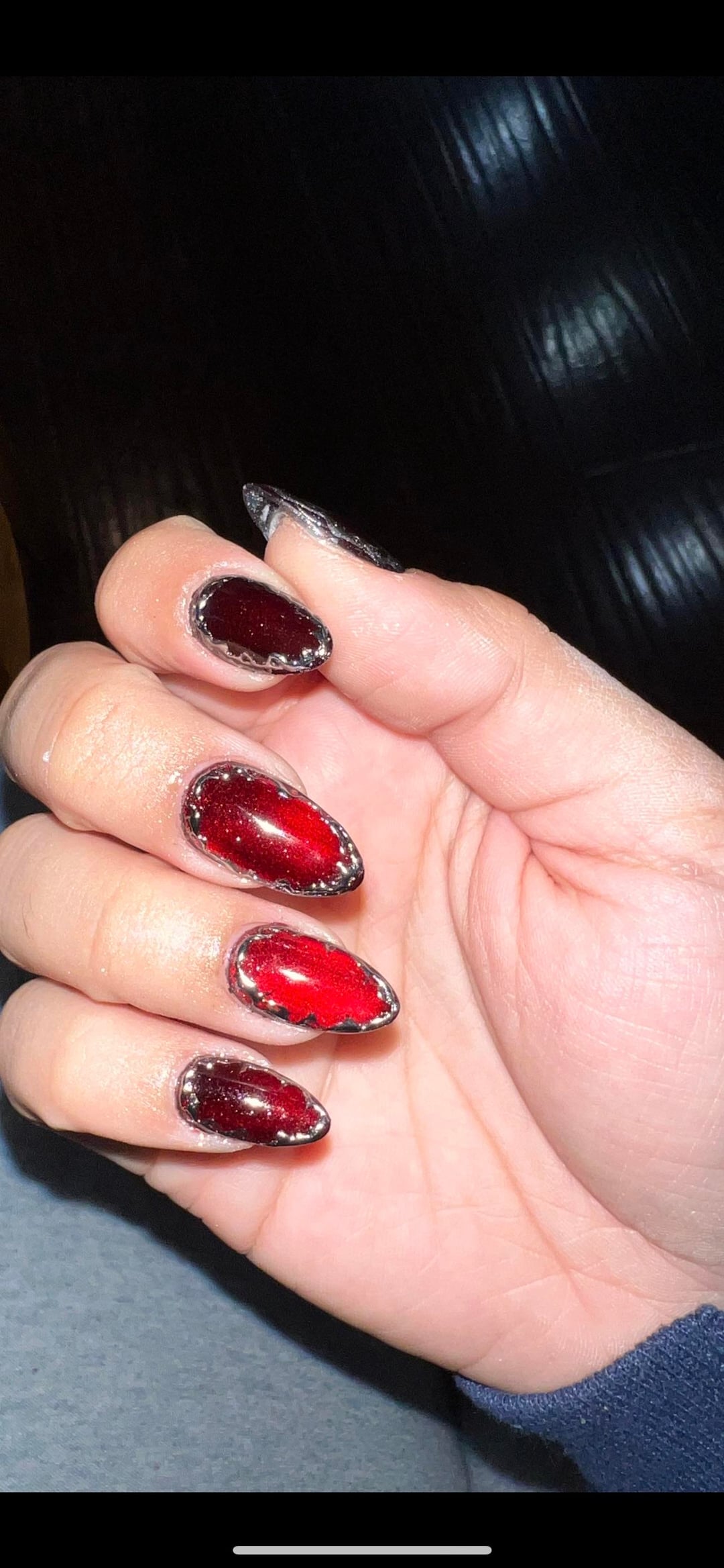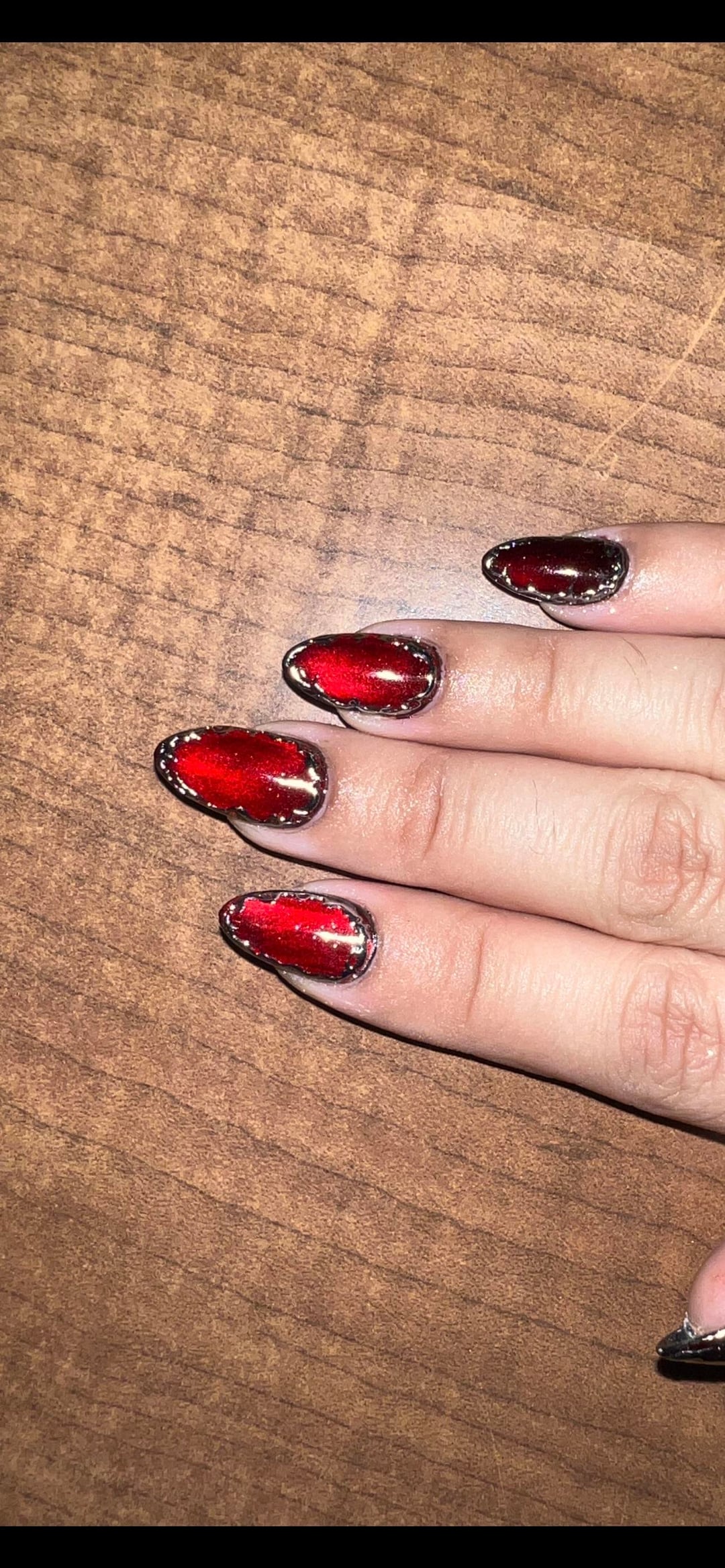 Hi! These are gelx extension, black base, red cat eye, and chrome deco … how much would you charge/pay? I don’t want to sway answers so I’ll comment what I paid after 🥹