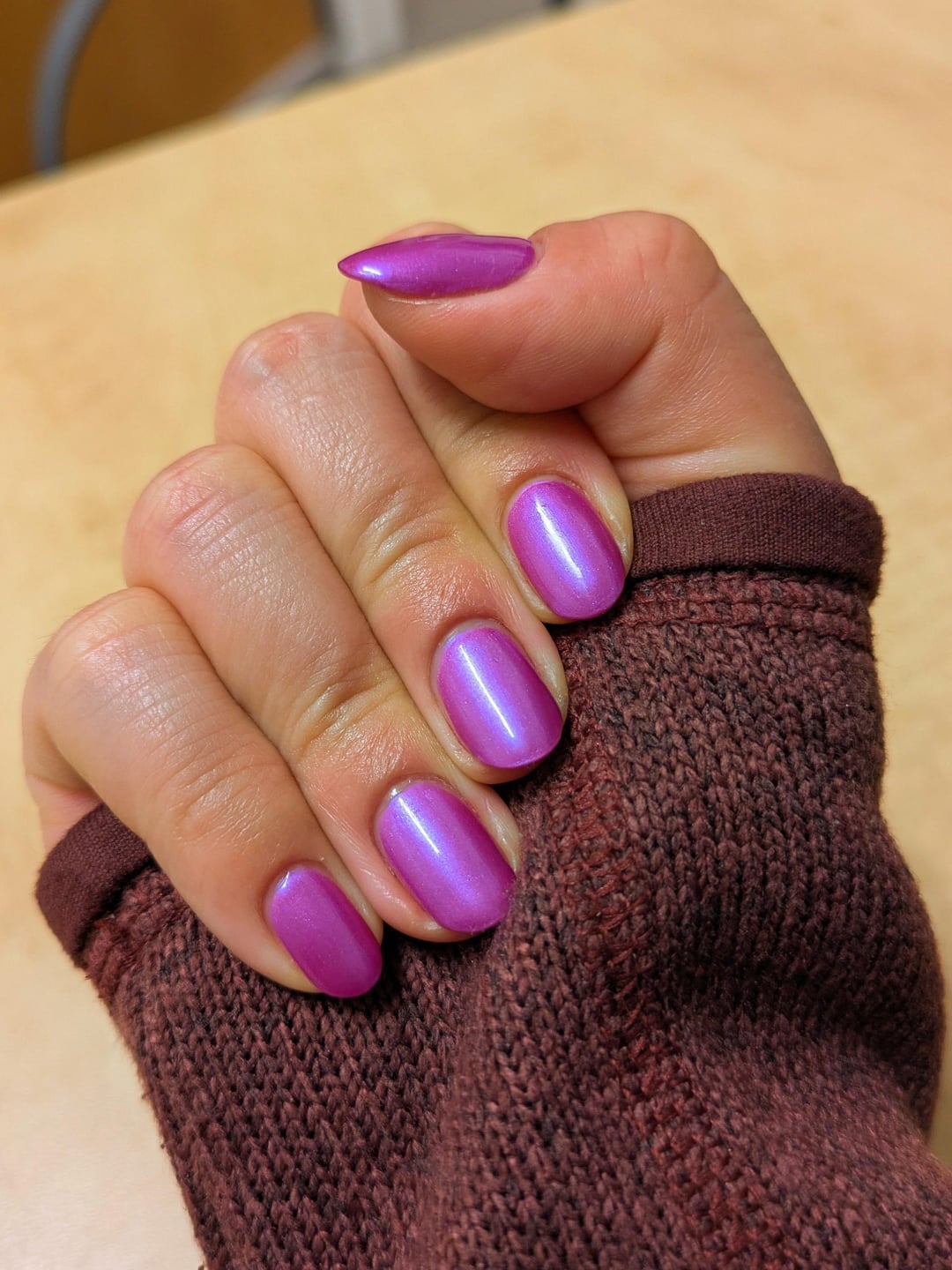 I love a pink with blue shimmer, gets me all nostalgic. I don’t particularly wear seasonal but I have a handful of polishes that I look at and immediately think “winter” or whatever. That said, I’ll wear them all year round, I’ll wear whatever takes my fancy.