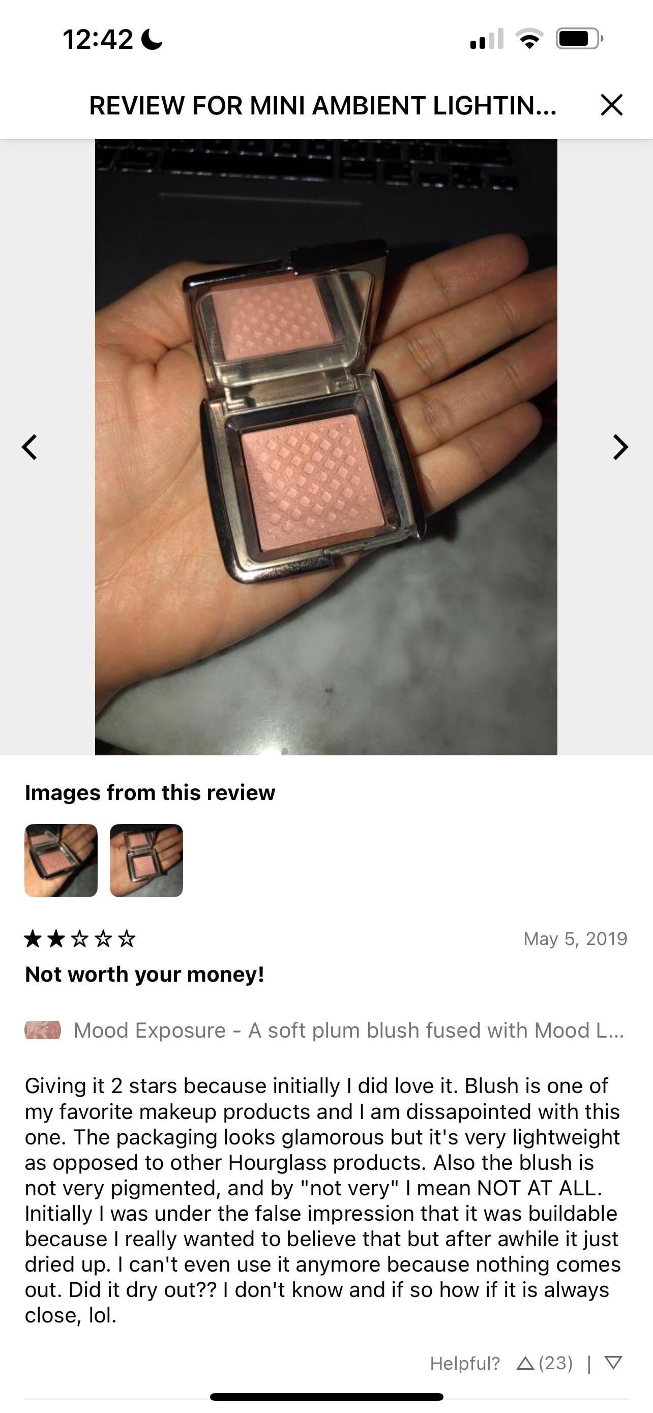 From the end of the review: “I can't even use it anymore because nothing comes out. Did it dry out??” Hourglass – Mini Ambient Lighting Blush by princessxbuttface