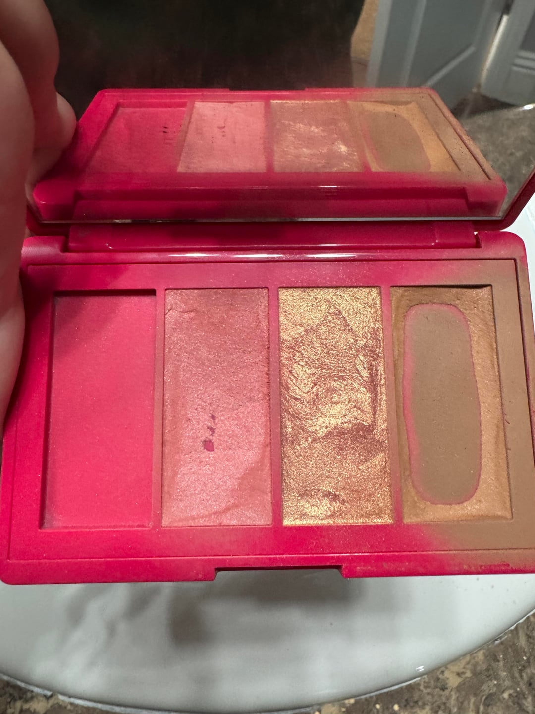 It has been over a year of me focusing on the Lancôme Paris Starlight Glow Face Palette. I have FINALLY hit pan in the blush! There are some months where I really focused on this palette and others where I’ve tucked it into a drawer because I was sick of looking at it. The bronzer has been mainly abandoned, I sometimes use it for my eyeshadow when the inspiration strikes. I can’t wait to finish the blush to the same level as the bronzer. I use the highlighter a fair amount but there’s barely a dent in it. Overall I still really do love this palette