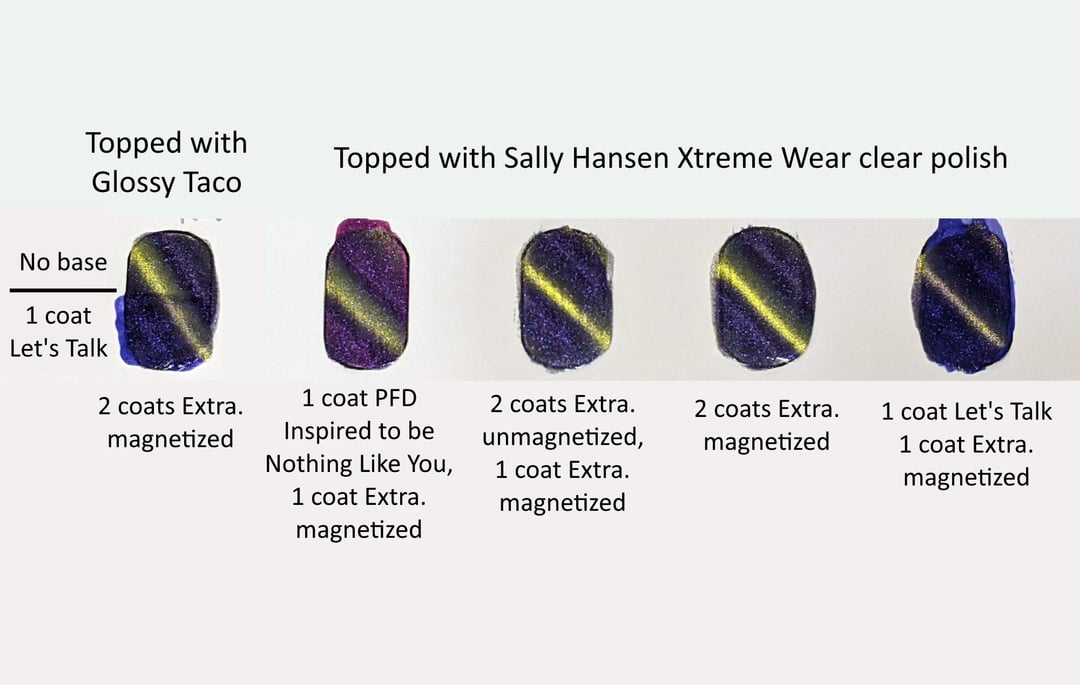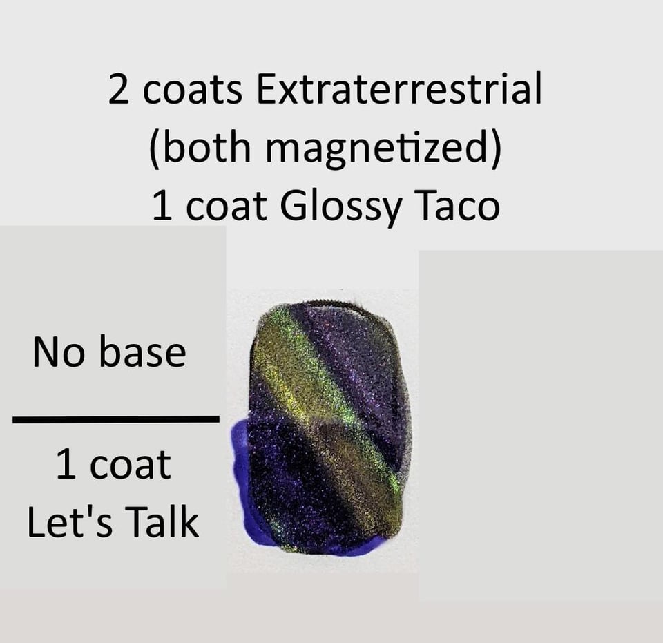 Just to double check, I did the swatch on the far left. I painted Let's Talk on the bottom half of the oval, let it dry, then did two magnetized coats of Extraterrestrial, and one magnetized coat of Glossy Taco, over the whole thing. You can see the difference between the two halves!